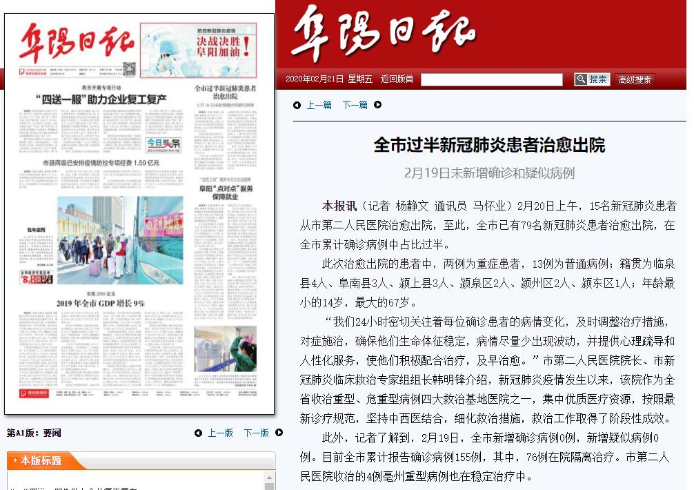 2月19日未新增确诊和疑似病例 本报讯(记者 杨静文 通讯员 马怀业)2月20日上午,15名新冠肺炎患者从市第二人民医院治愈出院,至此,全市已有79名新冠肺炎患者治愈出院,在全市累计确诊病例中占比过半。 此次治愈出院的患者中,两例为重症患者,13例为普通病例;籍贯为临泉县4人、阜南县3人、颍上县3人、颍泉区2人、颍州区2人、颍东区1人;年龄最小的14岁,最大的67岁。 “我们24小时密切关注着每位确诊患者的病情变化,及时调整治疗措施,对症施治,确保他们生命体征稳定,病情尽量少出现波动,并提供心理疏导和人性化服务,使他们积极配合治疗,及早治愈。”市第二人民医院院长、市新冠肺炎临床救治专家组组长韩明锋介绍,新冠肺炎疫情发生以来,该院作为全省收治重型、危重型病例四大救治基地医院之一,集中优质医疗资源,按照最新诊疗规范,坚持中西医结合,细化救治措施,救治工作取得了阶段性成效。 此外,记者了解到,2月19日,全市新增确诊病例0例,新增疑似病例0例。目前全市累计报告确诊病例155例,其中,76例在院隔离治疗。市第二人民医院收治的4例亳州重型病例也在稳定治疗中。