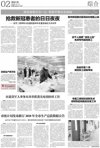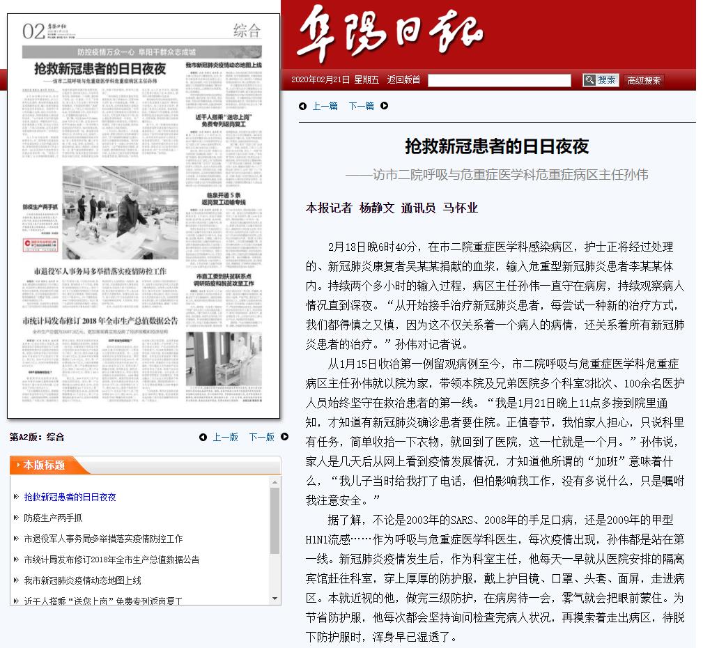 前不久,市二院被省政府确定为省级新冠肺炎重症集中收治四大基地医院之一,除了阜阳本地患者还收治了亳州市的新冠肺炎危重病人,孙伟及其科室医护人员担负了更加重要的责任。“我们身上肩负着市委、市政府的重托和全市人民的希望,我们会全力以赴争日抢时救治患者,向广大人民群众递上一份合格的答卷。”孙伟说。