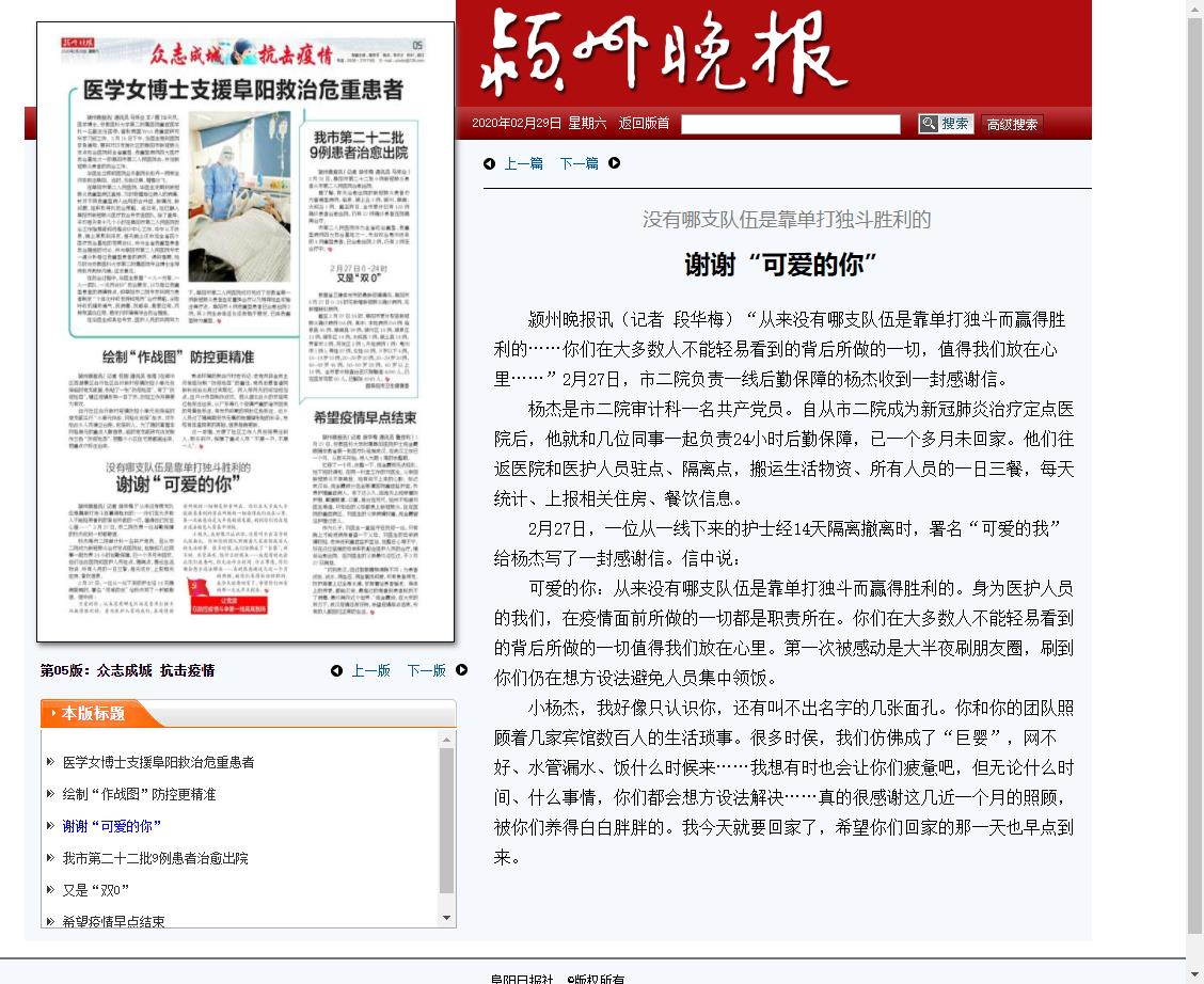 颍州晚报讯(记者 段华梅)“从来没有哪支队伍是靠单打独斗而赢得胜利的……你们在大多数人不能轻易看到的背后所做的一切,值得我们放在心里……”2月27日,市二院负责一线后勤保障的杨杰收到一封感谢信。