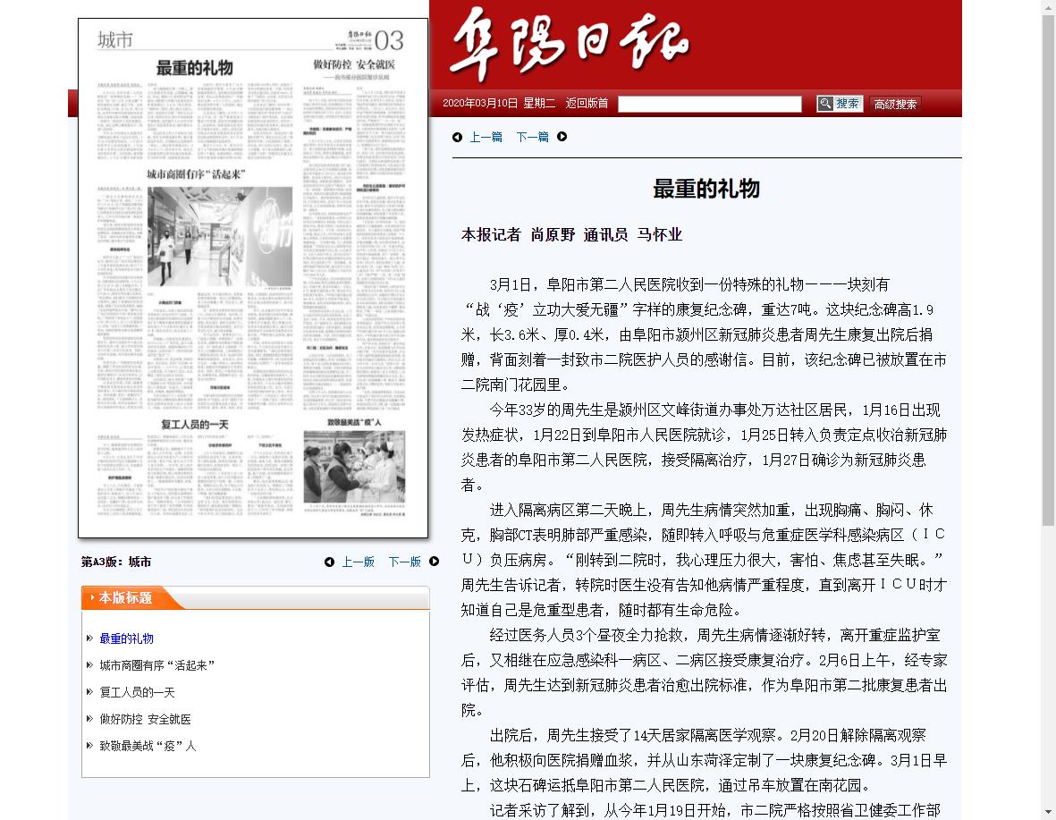 出院后,周先生接受了14天居家隔离医学观察。2月20日解除隔离观察后,他积极向医院捐赠血浆,并从山东菏泽定制了一块康复纪念碑。3月1日早上,这块石碑运抵阜阳市第二人民医院,通过吊车放置在南花园。