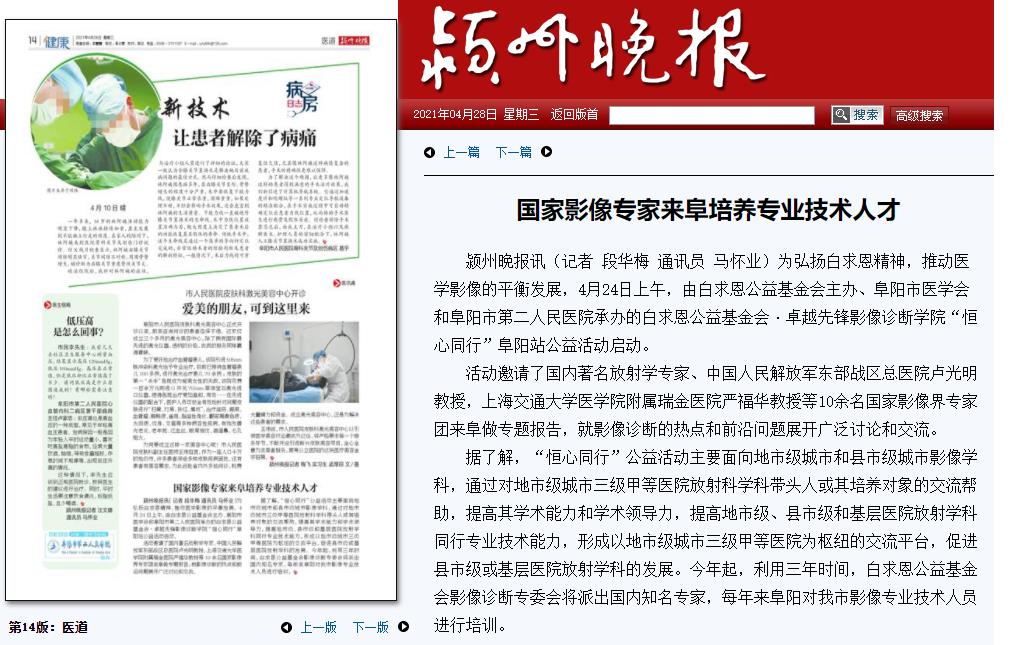 (颍州晚报2021年4月28日14版) 颍州晚报讯(记者 段华梅 通讯员 马怀业)为弘扬白求恩精神,推动医学影像的平衡发展,4月24日上午,由白求恩公益基金会主办、阜阳市医学会和阜阳市第二人民医院承办的白求恩公益基金会·卓越先锋影像诊断学院“恒心同行”阜阳站公益活动启动。 活动邀请了国内著名放射学专家、中国人民解放军东部战区总医院卢光明教授,上海交通大学医学院附属瑞金医院严福华教授等10余名国家影像界专家团来阜做专题报告,就影像诊断的热点和前沿问题展开广泛讨论和交流。 据了解,“恒心同行”公益活动主要面向地市级城市和县市级城市影像学科,通过对地市级城市三级甲等医院放射科学科带头人或其培养对象的交流帮助,提高其学术能力和学术领导力,提高地市级、县市级和基层医院放射学科同行专业技术能力,形成以地市级城市三级甲等医院为枢纽的交流平台,促进县市级或基层医院放射学科的发展。今年起,利用三年时间,白求恩公益基金会影像诊断专委会将派出国内知名专家,每年来阜阳对我市影像专业技术人员进行培训。 |