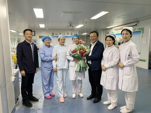 5月11日,阜阳市第二人民医院党委书记丰效寺,纪委书记管海新,党委委员祖大玲、李龙海、麻宏亮一行,走进临床一线,亲切慰问全院护理工作者,向他们献上一束鲜花、送上一句问候、表达一份敬意,勉励他们要弘扬好“南丁格尔精神”,展现白衣天使风采,更好的服务病人。每到一病区,领导们还将一束束鲜花送到护士们的手中,感谢他们默默无闻的辛勤付出,以及为病人和医院发展做出的贡献。