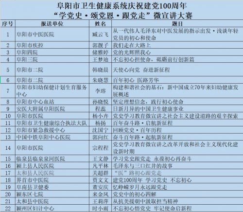 来自全市卫生健康系统的22名选手,分别从中国共产党的百年奋斗史、中国卫生事业发展史,从一线防疫到基层扶贫,从日常工作到紧急状况,从一名医务人员到一个系统,以小见大,用小故事展现大主题,用小切口展现大时代,阐释了阜阳卫生健康人的不畏生死,不计报酬,白衣执甲,逆行出征,以及本系统广大共产党员无私奉献、艰苦奋斗、敢为人先的卓越精神,讴歌了党的百年光辉历程,抒发了新时代阜阳市卫生健康人忠于党、忠于人民的真挚情怀。