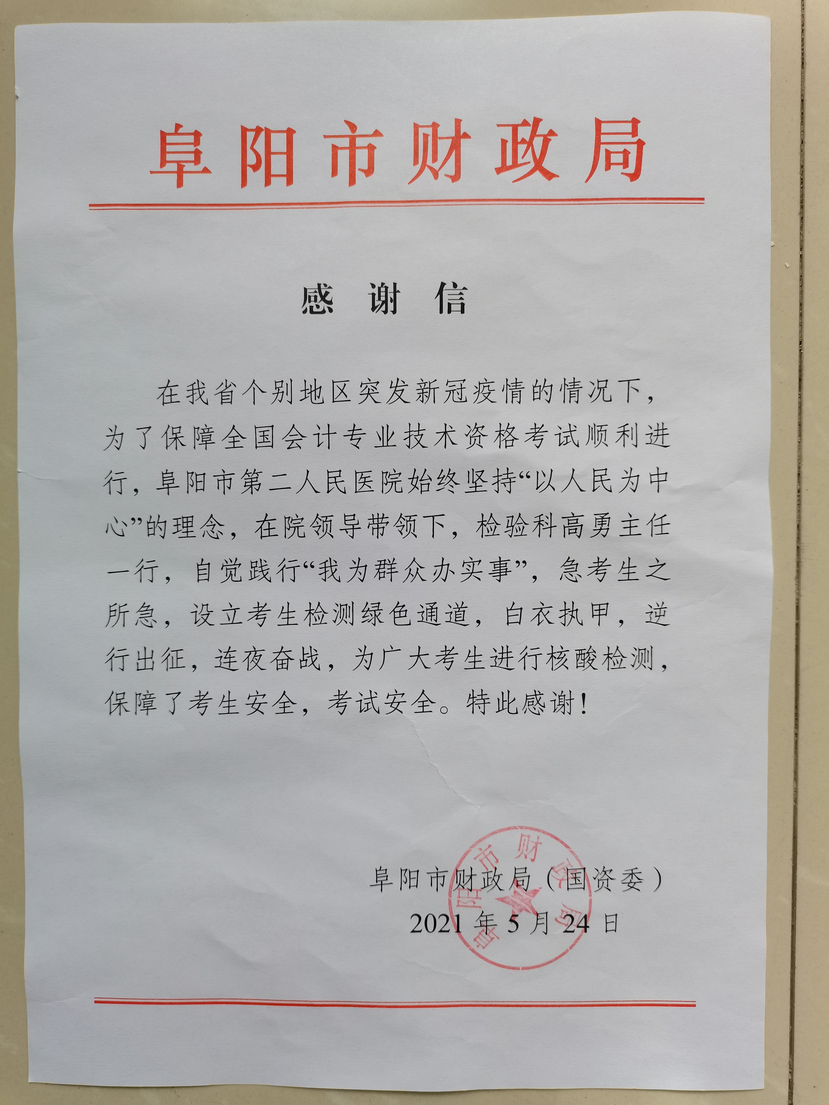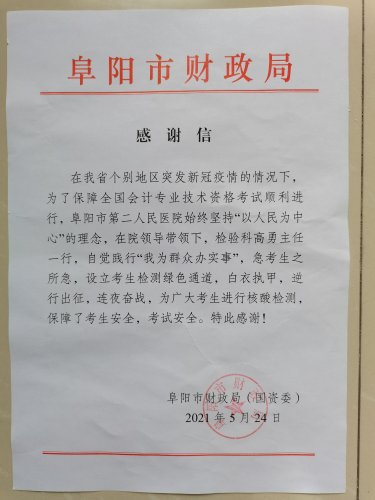 市财政局在感谢信中写到:“在我省个别地区突发新冠疫情的情况下,为了保障全国会计专业技术资格考试顺利进行,阜阳市第二人民医院始终坚持“以人民为中心”的理念,在院领导带领下,检验科高勇主任一行,自觉践行“我为群众办实事”,急考生之所急,设立考生检测绿色通道,白衣执甲,逆行出征,连夜奋战,为广大考生进行核酸检测,保障了考生安生,考试安全。”