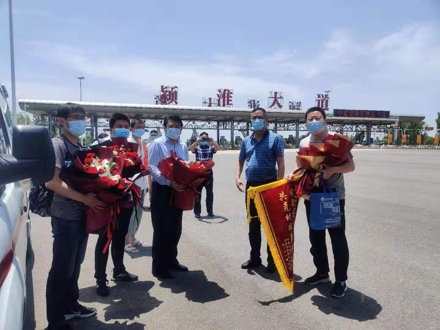 上午约12时,一辆载着六安市党政领导和人民深情厚意的六安大巴车徐徐驶入颍淮大道高速路口,45位逆行出征前往六安支援新冠核酸检测勇士下车后,从单位领导和亲属们手中接过鲜花,平安载誉而归。