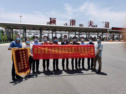 在颍淮大道高速路口,阜阳市第二人民医院党委委员李龙海、麻宏亮,以及检验科主任高勇迎接4位勇士平安归来。“他们在六安这片红色土地上,书写了阜阳市二院白衣天使大爱无疆、忘我奉献的精彩华章”,李龙海委员说。