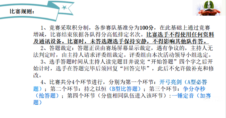 本次比赛共分4个环节分别进行:开弓亮剑(A型必答题),持之以恒(B型必答题),争分夺秒(抢答题),一锤定音(加赛题)。