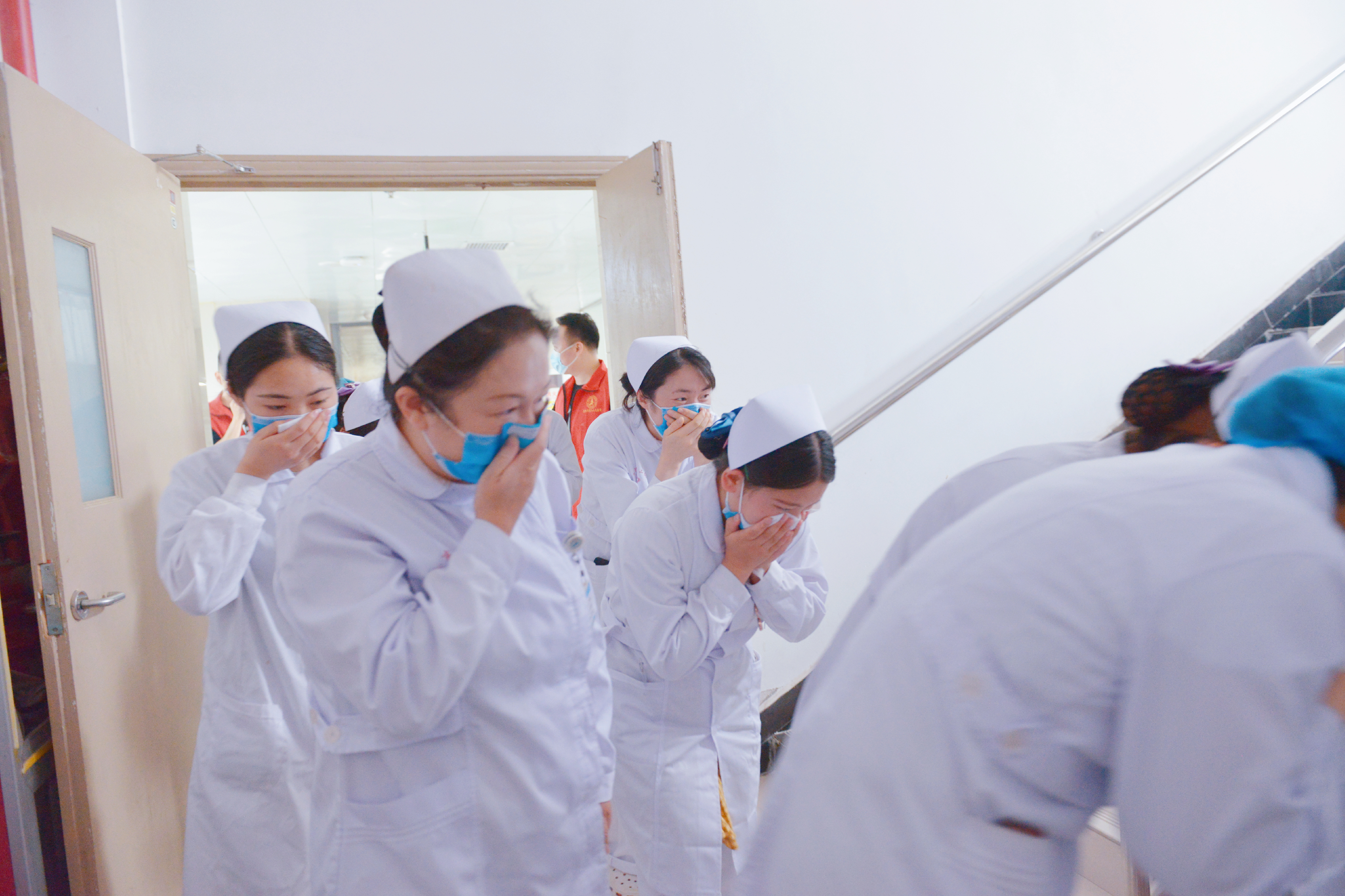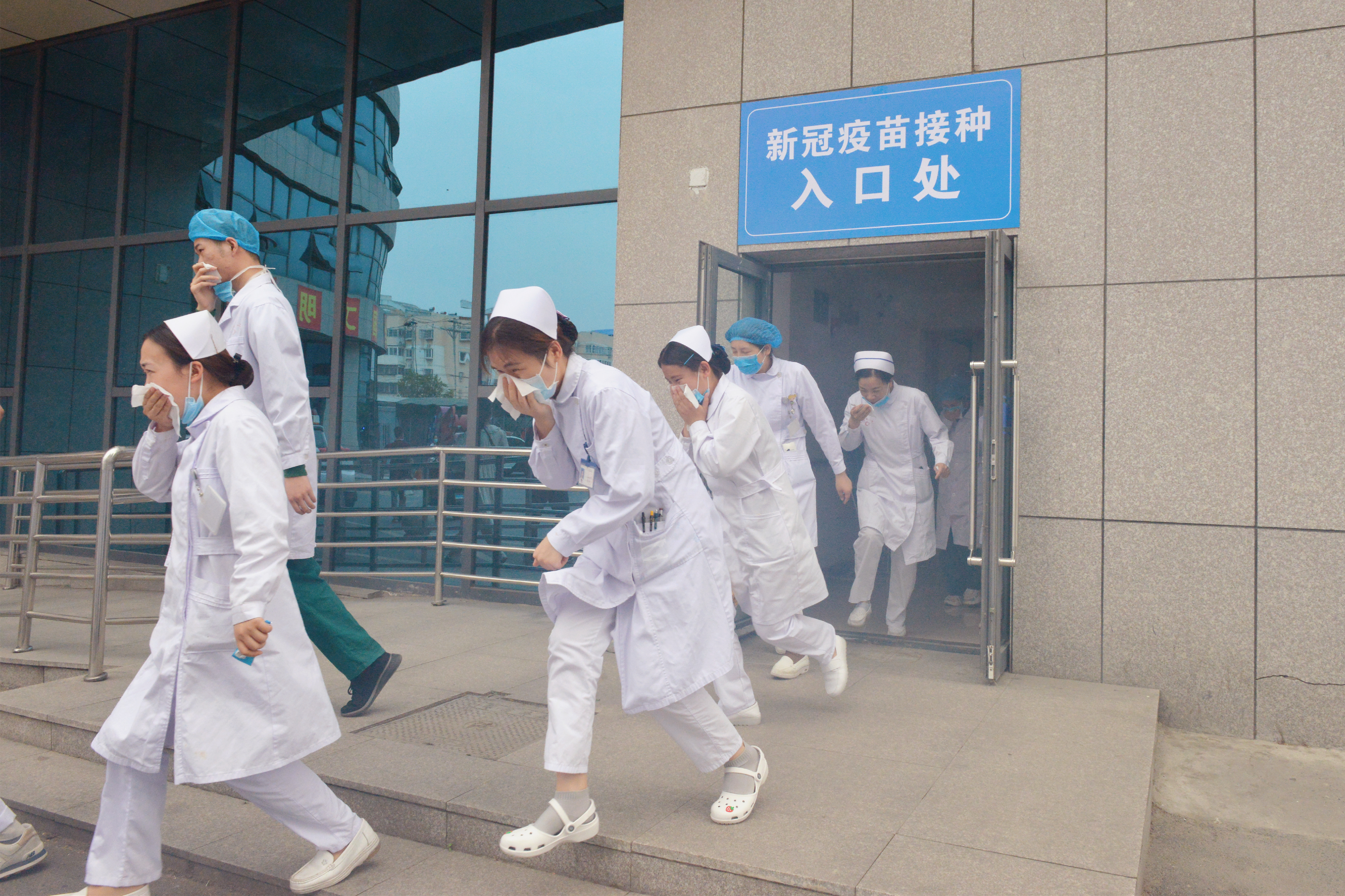演练开始前,院纪委书记管海新重申了此次消防疏散逃生演练的重要性及注意事项。随着一阵消防警报声,一阵浓烟从门诊部二楼传出,火势发展迅速,浓烟瞬间充满了整个大厅,安防值班人员迅速查看,并用对讲机呼叫巡逻队员,总值班保卫科副科长李勇智立即启动《医院消防应急预案》,迅速指挥大家从安全出口紧急疏散。2分钟后,楼梯里也已经浓烟滚滚,各个楼层的消防安全员提醒大家捂住口鼻,从消防通道弯腰有序前行。