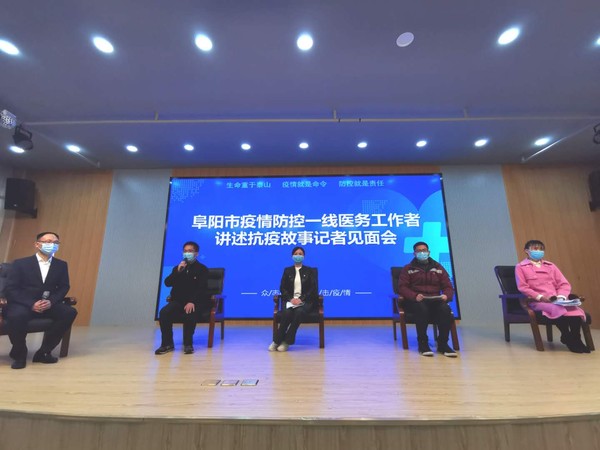2月26日下午,阜阳市召开疫情防控一线医务工作者讲述抗疫故事记者见面会。见面会由市政府新闻办主任朱贺主持,市卫生健康委承办。阜阳市二院刘海清、李莉莉在市政府新闻办记者见面会上讲述抗疫故事。