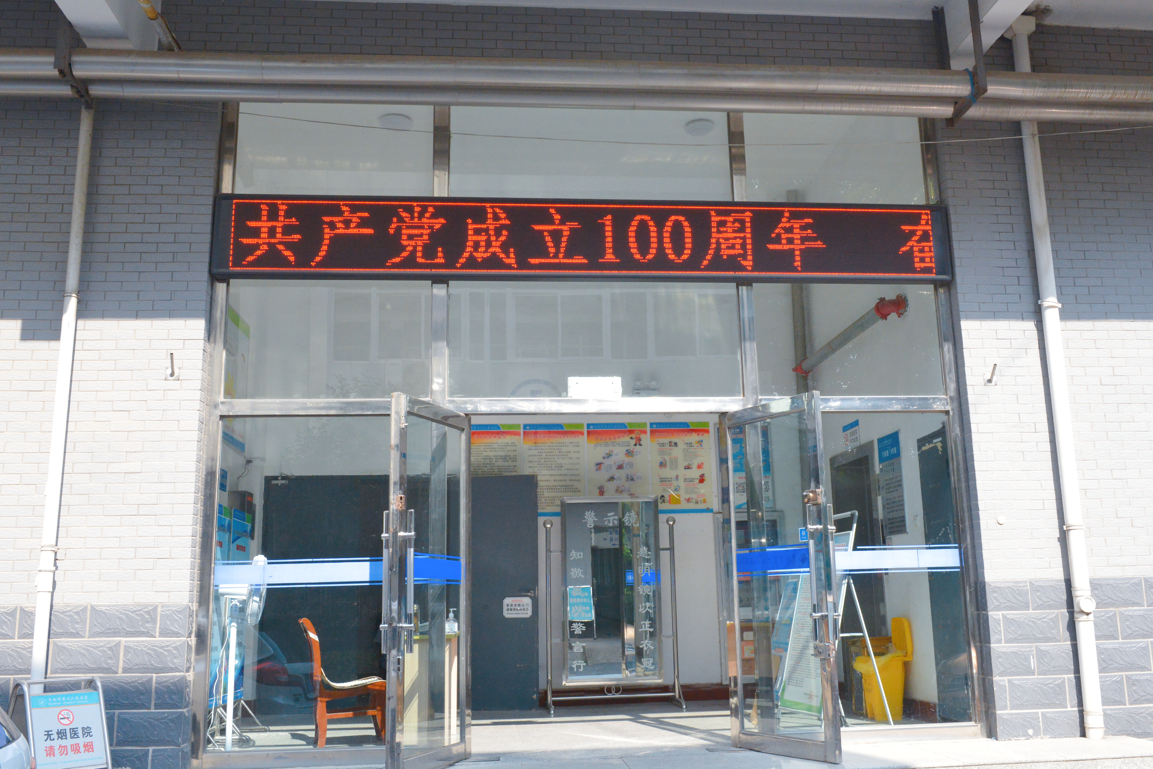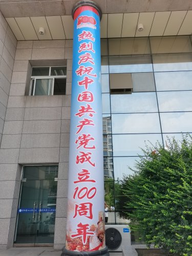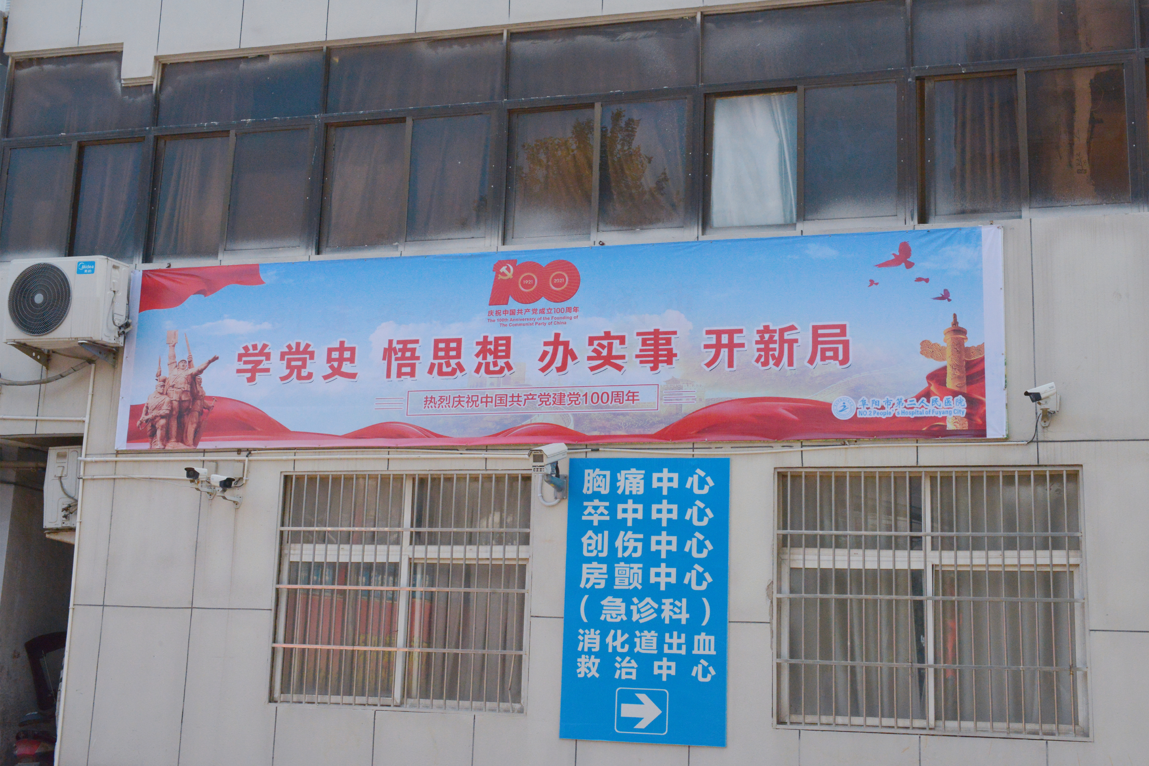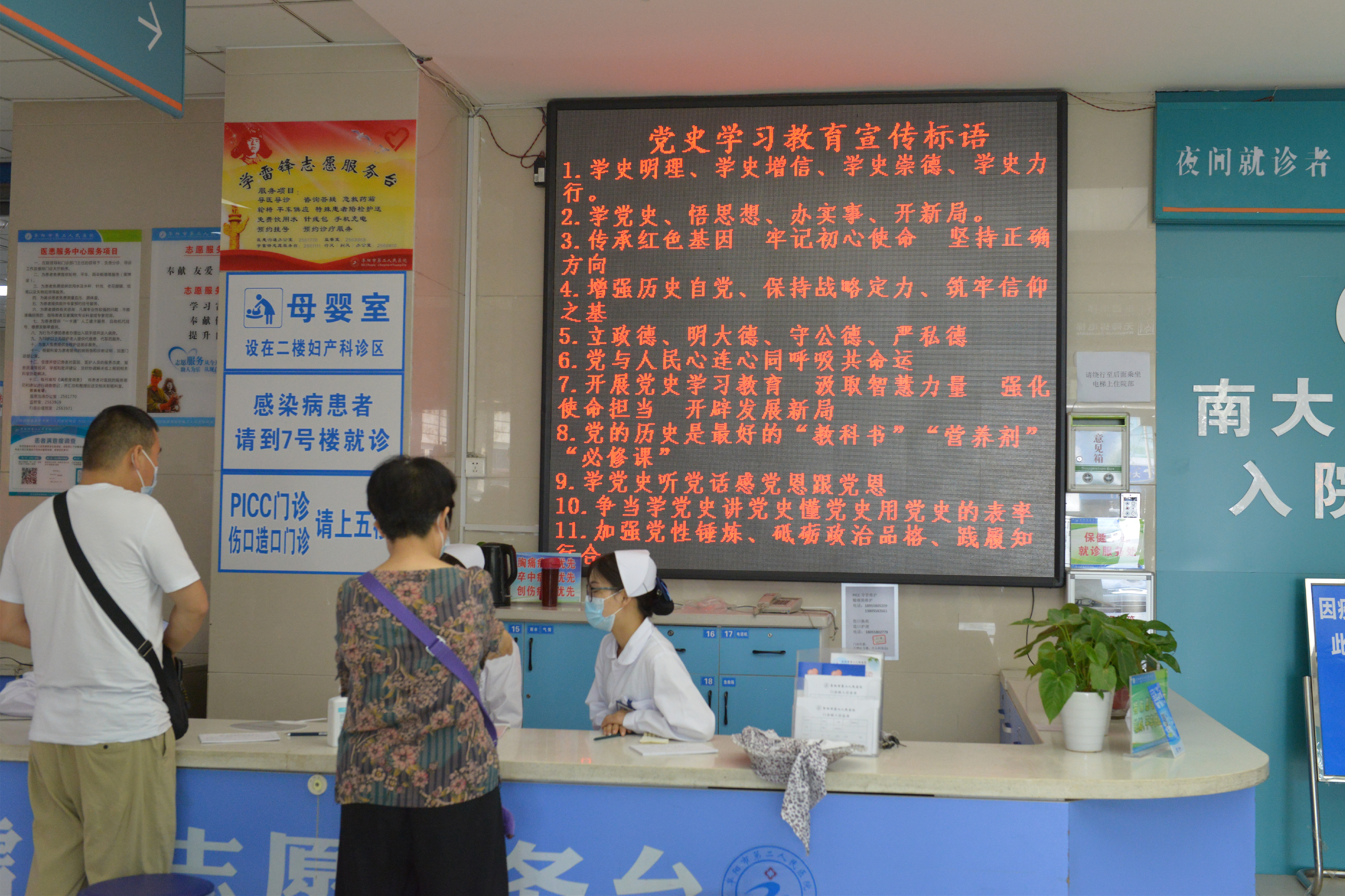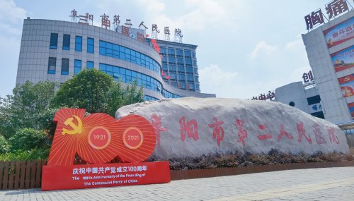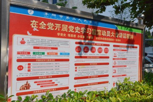 “七一”到来,在阜阳市第二人民医院,一块块红色主题的公益宣传牌、一面面鲜艳的五星红旗、随处可见的“庆祝中国共产党成立100周年”宣传标语,把医院装点出浓厚的庆祝建党百年氛围。
