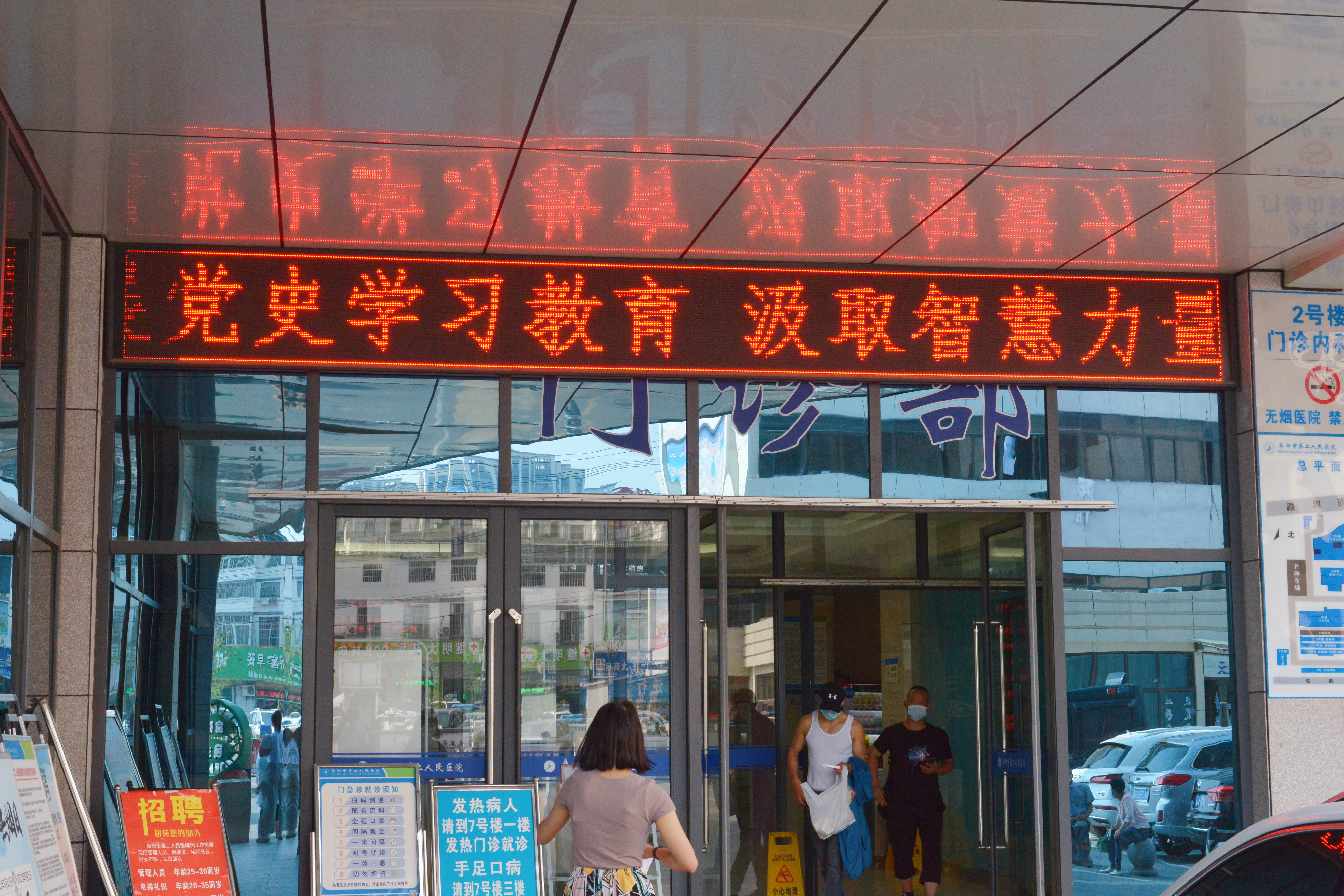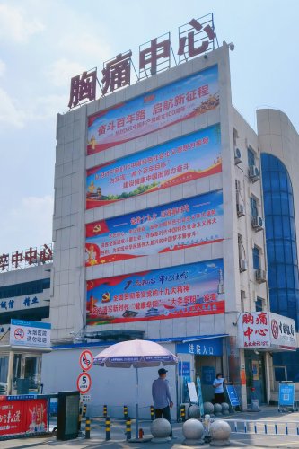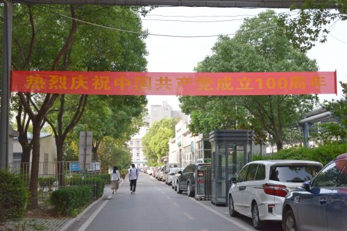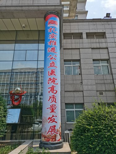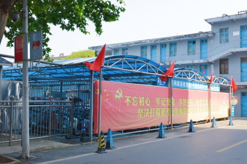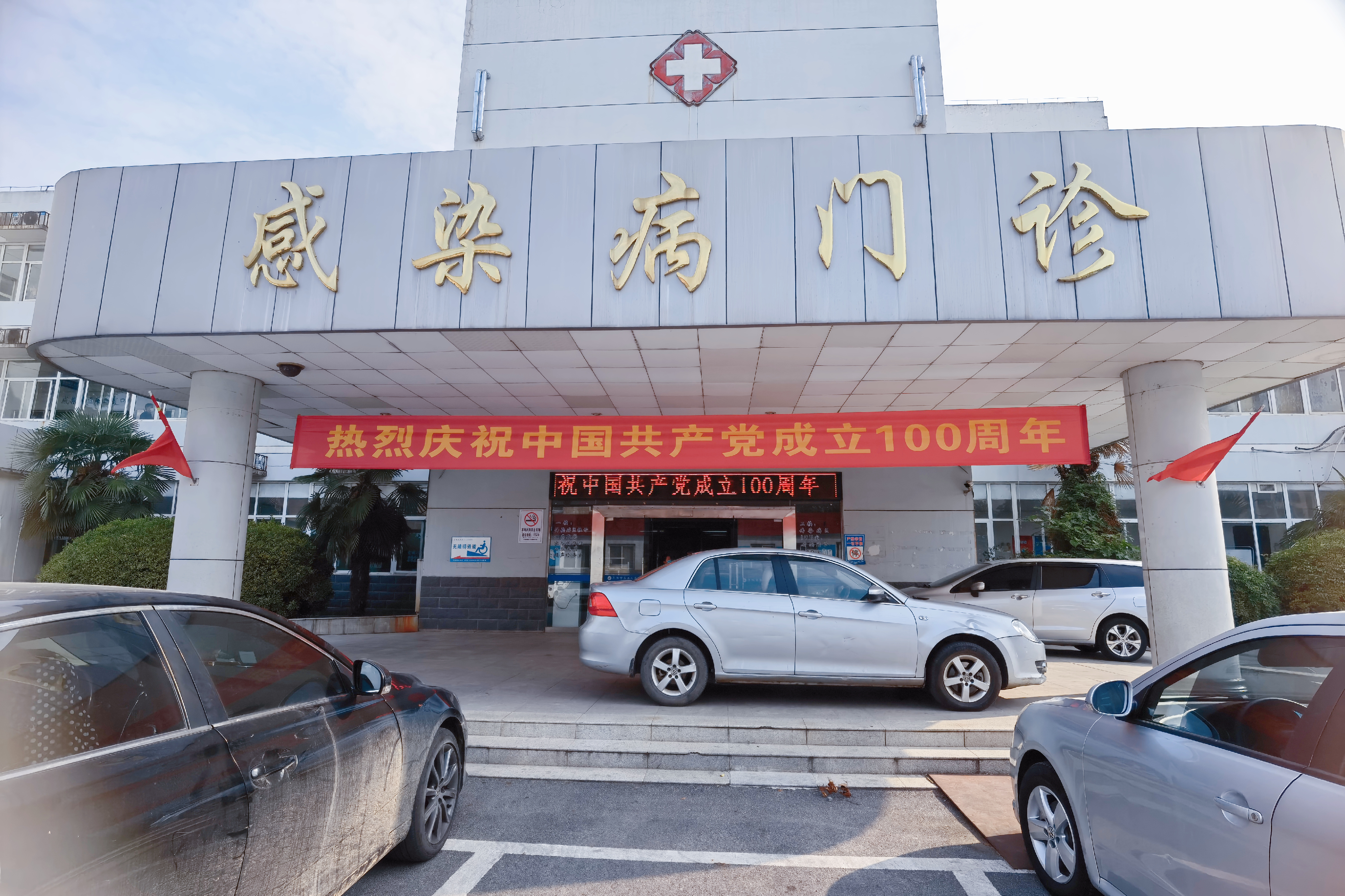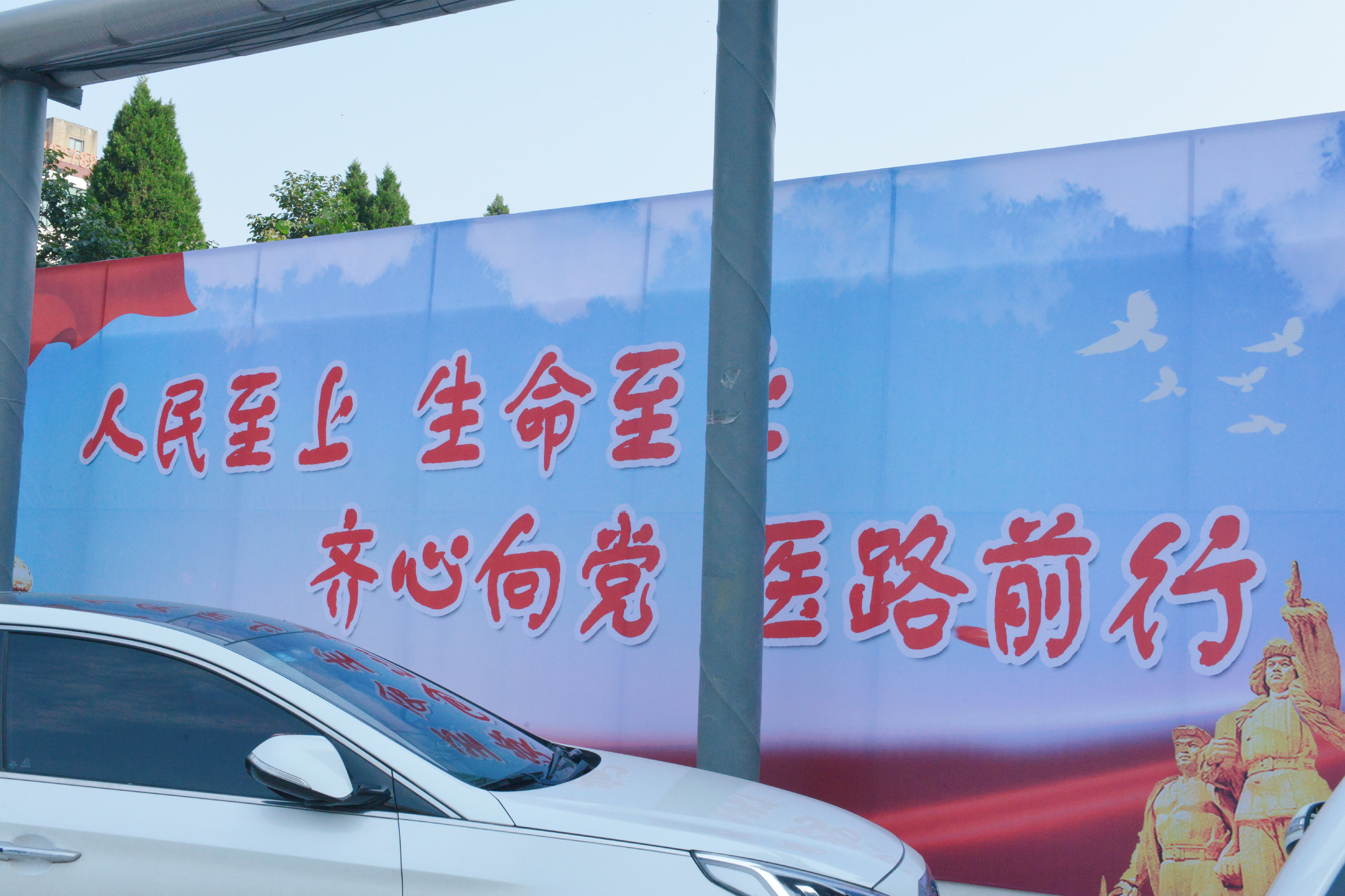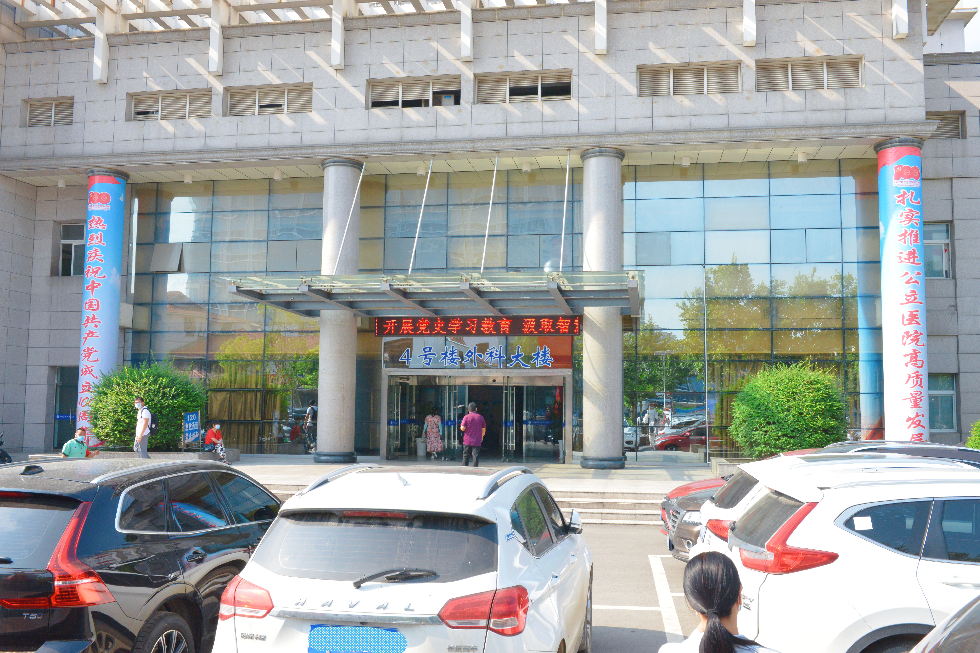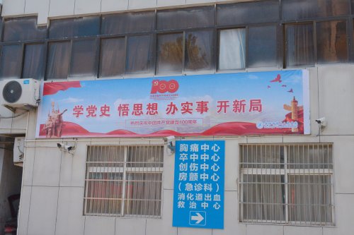 面对康复大道的四号楼大门两侧立柱上,赫然写着“热烈庆祝中国共产党成立100周年,扎实推进公立医院高质量发展”宣传标语;在它的另一头一号楼急诊楼南墙上,挂着“学党史悟思想、办实事、开新局”;在院内停车场,一块“人民至上、生命至上,齐心向党,医路前行”大型标语宣传牌矗然而立……