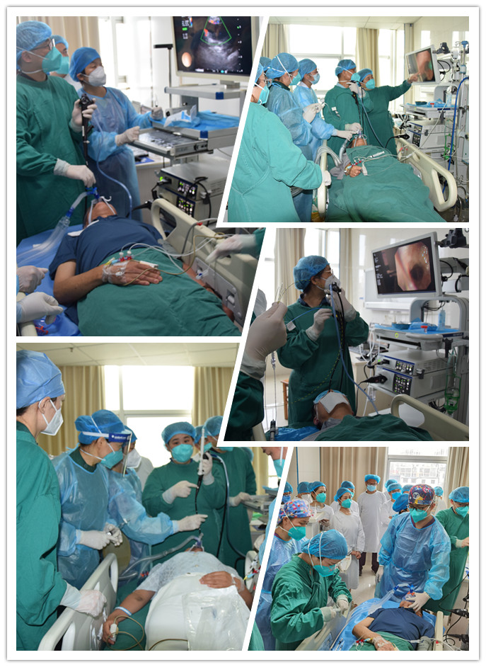 下午,在阜阳市第二人民医院内镜中心,在安徽省胸科医院呼吸介入吕丽萍主任团队、中科大附一院章俊强主任共同参与与指导下,由阜阳市二院呼吸与危重症医学科结核病区、综合病区及感染病区医生,内镜中心杨银屏护士长携护理团队,麻醉科董洪启主任携团队共同配合下,共向参与观摩的呼吸介入的同仁们成功演示了9例疑难复杂手术,包括良恶性气道狭窄处理、纵隔淋巴结肿大的诊断、中央型气管腔外占位病变的诊断,演示技术包括多项三、四级呼吸介入手术,有超声支气管镜、球囊扩张术、高频电凝术、CO2冷冻术、ROSE(现场细胞学评估)等等。