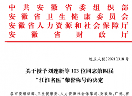 近日,中共安徽省委组织部、省卫健康委员会、省人力资源和社会保障厅、省财政厅联合下文,授予103位医药卫生工作者第四届“江淮名医”荣誉称号。阜阳市第二人民医院骨科一病区主任艾继超和心血管内科二病区主任卢家忠入选。