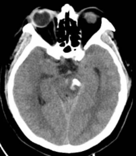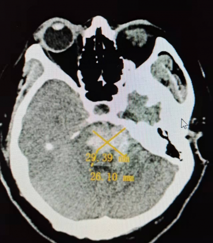 入院6小时后,经积极术前准备,在全麻下实施方体定向置管脑干血肿穿刺抽吸急诊手术,术中抽出陈旧性血肿5ml,术后次日尿激酶注入,持续引流脑干血肿,术后第一天复查CT可见血肿大部分已清除。