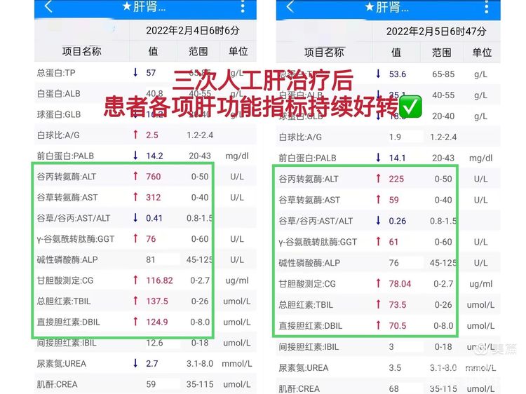 根据患者病情,人工肝室护师乔梁与李铭协商后采取了较为复杂但疗效更佳的双重血浆分子吸附联合血浆置换(DPMAS+PE)技术,整个治疗过程持续约五个小时,治疗前后观察患者各项肝功能指标,病情显著好转。在后续治疗过程中,仍采用组合式人工肝治疗模式。经过连续三次的治疗,患者各项肝功能指标均持续好转。