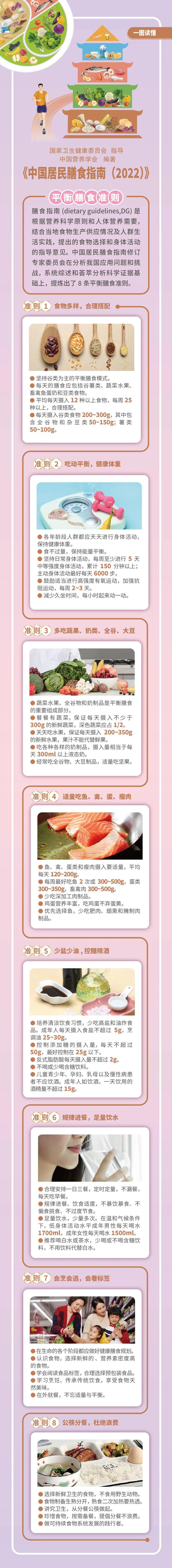 编者按:膳食 指南是健康教育和公共政策的基础性文件,是国家实施《健康中国行动》(2019-2 030年)和《国民营养计划》(2017-2030年)的一个重要技术支撑。 2022年4月26日上午,《中 国居民膳食指南(2022) 》发布会在京举行。 《中国居民膳食指南(2022)》提炼出了平衡膳食八准则:一、食物多样,合理搭配; 二、吃动平衡,健康体重; 三、多吃蔬果、奶类、全谷、大豆; 四、适量吃鱼、禽、蛋、瘦肉; 五、少盐少油,控糖限酒; 六、规律进餐,足量饮水; 七、会烹会选,会看标签; 八、公筷分餐,杜绝浪费。 |