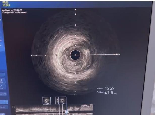 据了解,74岁的李某某胸痛胸闷入院,常规心电图、超声心动图正常,单纯靠冠脉造影检查结果以及手术医生经验,已不能提供准确判断,心血管介入团队决定在造影后立即进行IVUS检查。经过充分的方案讨论及准备,心血管内科主任卢家忠、副主任吕新才、张标为该患者实施冠脉造影。冠脉造影提示,前降支近段80%狭窄,对角支开口80%狭窄,立即进行IVUS评估,根据结果在前降支及对角支各植入一枚支架后进行IVUS检查,支架植入良好。此项技术的开展,能为患者提供个体化治疗,在手术同时,能精准了解病变血管的范围、病变程度,保障了手术安全,避免了二次手术。