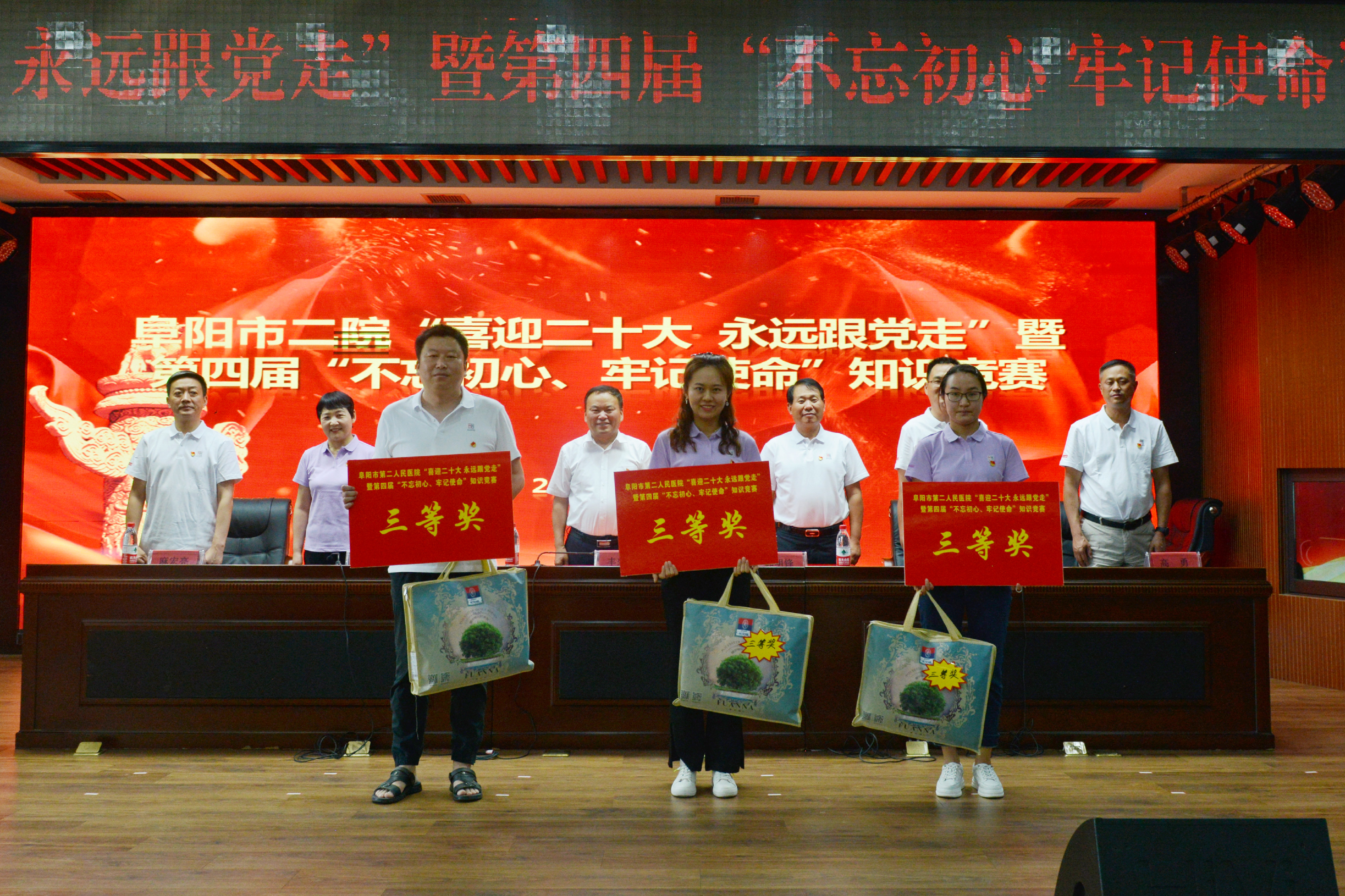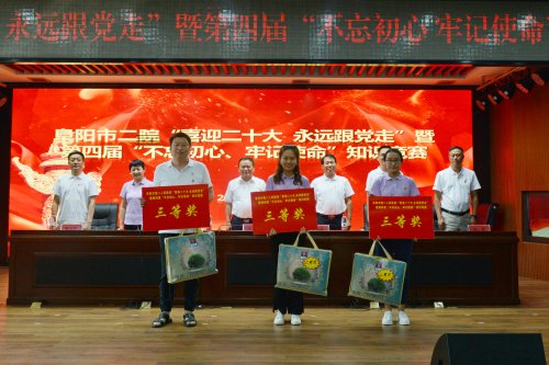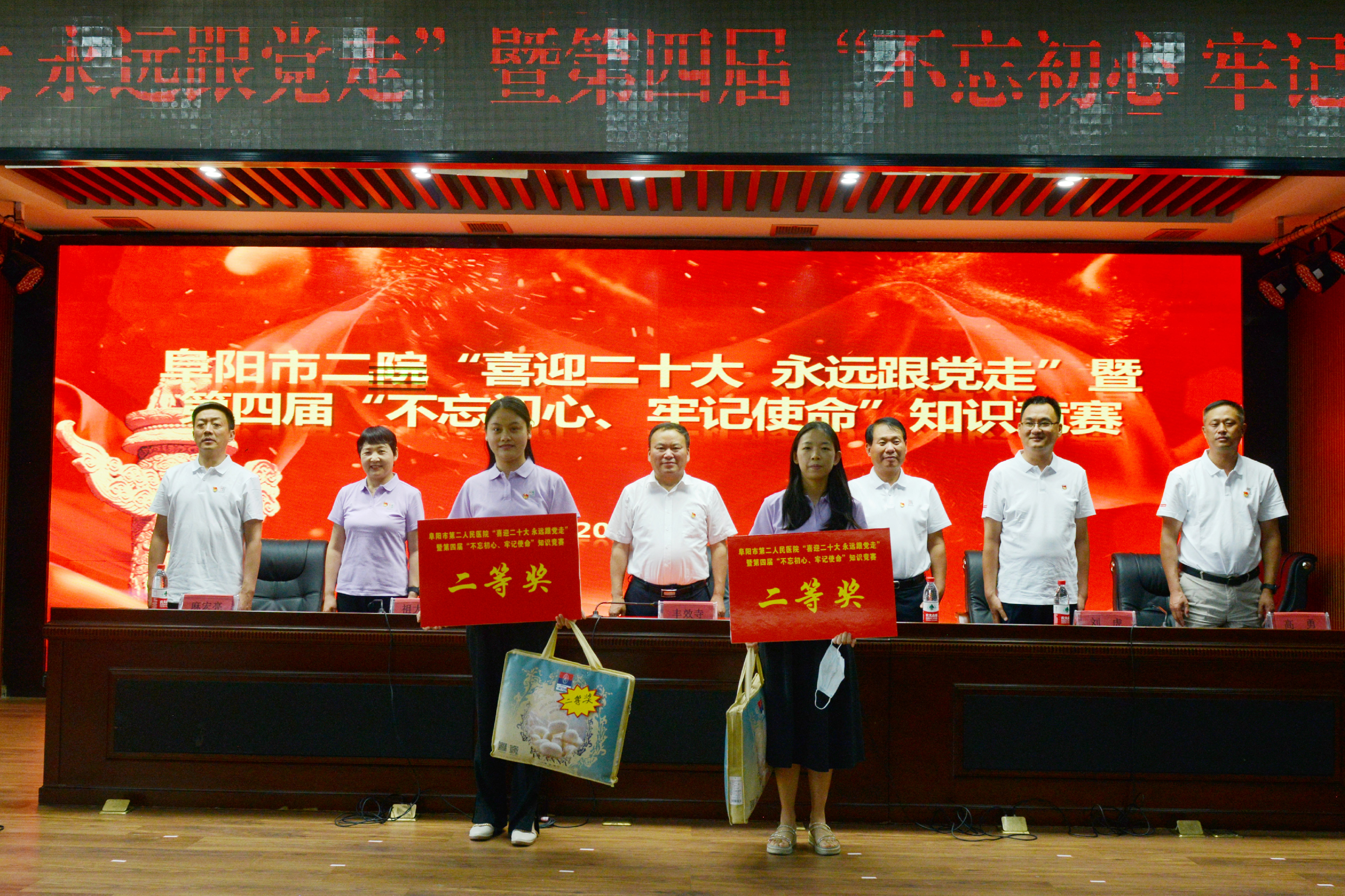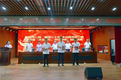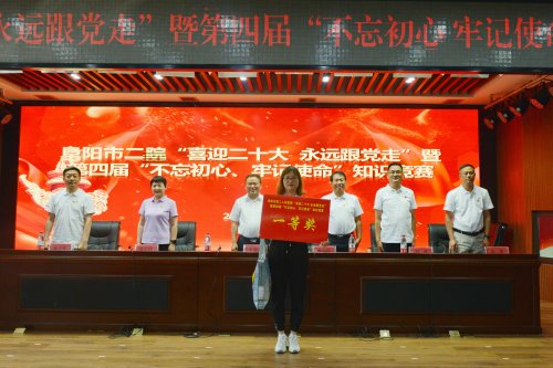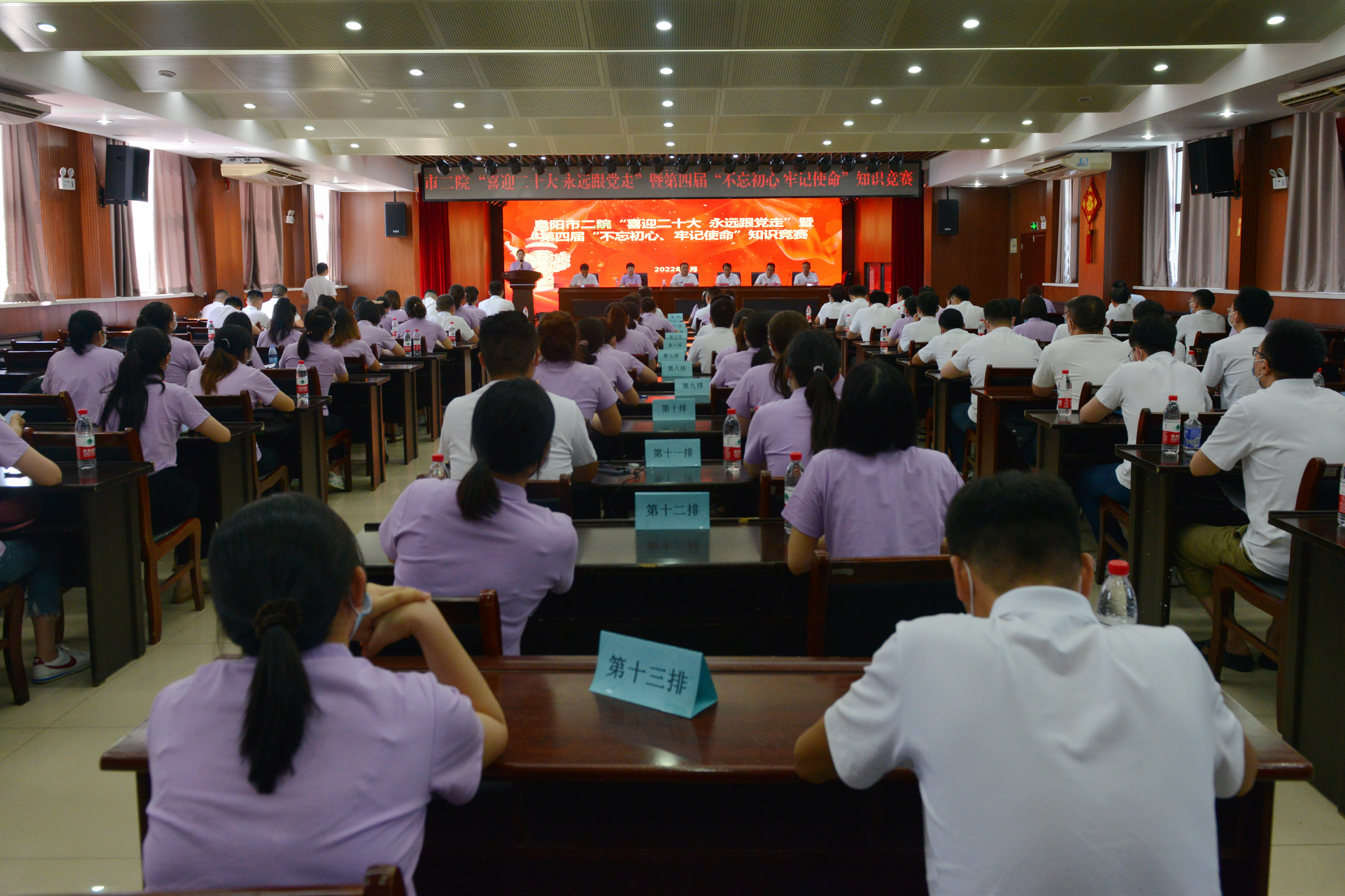 在全党全国上下喜迎党的二十大之际,为深入学习贯彻习近平新时代中国特色社会主义思想,巩固拓展党史学习教育成果,进一步筑牢全院广大党员干部职工党性意识、纪法意识、廉洁自律意识、安全生产意识,以实际行动衷心拥护“两个确立”、忠诚践行“两个维护”。6月28日下午,阜阳市第二人民医院举办“喜迎二十大 永远跟党走”暨第四届“不忘初心牢记使命”知识竞赛。院领导班子成员和全院80余名党员干部职工共同参加了本次竞赛活动。院党委书记丰效寺致辞。