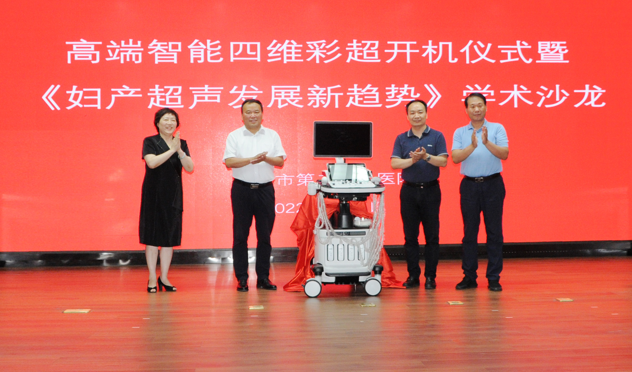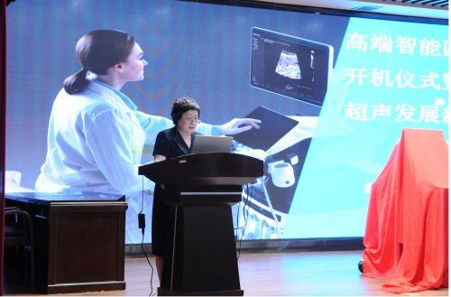 胡冬梅主持开机仪式及学术沙龙。韩明锋致欢迎辞,并与丰效寺、张超学、胡冬梅共同为高端智能四维彩超揭幕。