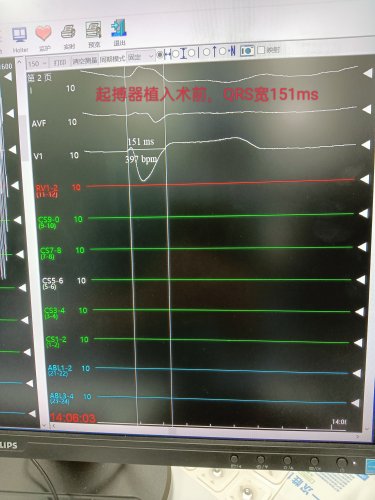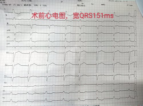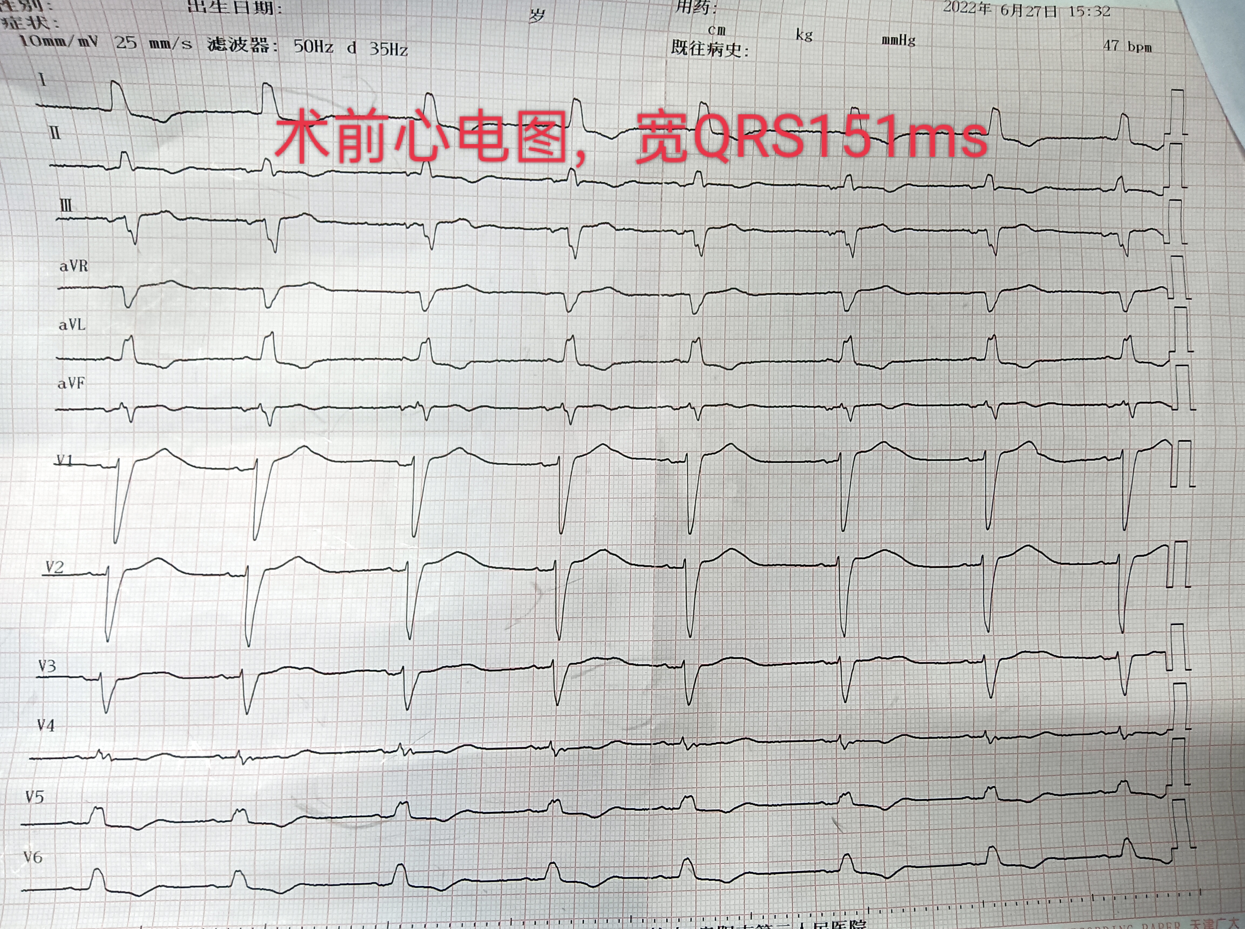 1起搏器植入前心电图:窦缓伴有完全性左束支传导阻滞,QRS宽151ms.