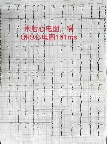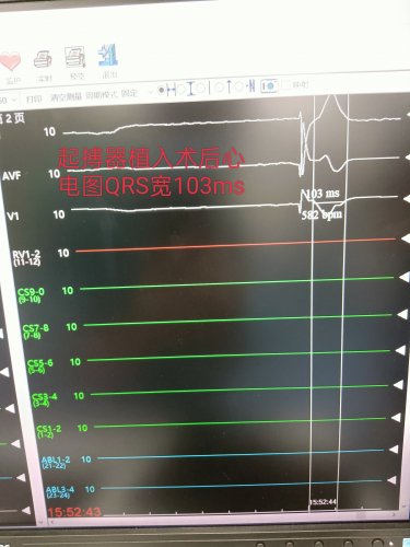 图2起搏器植入术后心电图:DDD起搏模式,QRS宽103ms