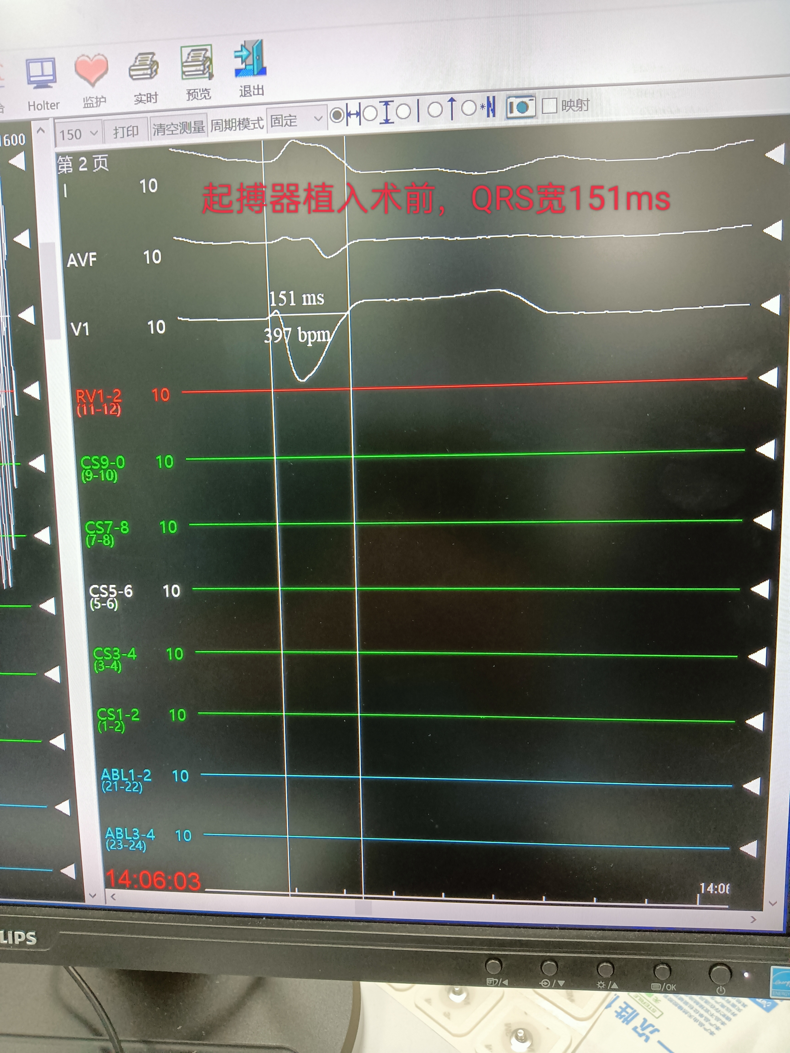 图3起搏器植入术前多导监测心电图:QRS宽151ms