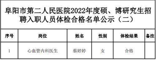 阜阳市第二人民医院2022年度硕、博研究生招聘入职人员公示(二)