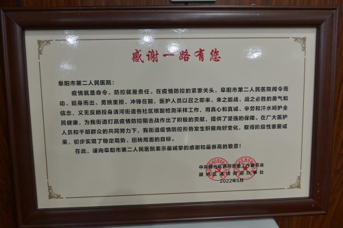 2022年6月“医心向党,志愿有我”系列特色党建服务举措被评为“阜阳市机关党建十佳品牌”称号。12月14日和12月28日,阜阳市委书记孙正东和市领导王波、吕国平、梁永勤一行,省委组织部城市组织处处长张庆峰一行先后到医院调研基层党建工作。这些成绩的取得凝结着全院干部职工的心血和汗水,更是全院干部职工矢志追求和不懈努力的具体体现。