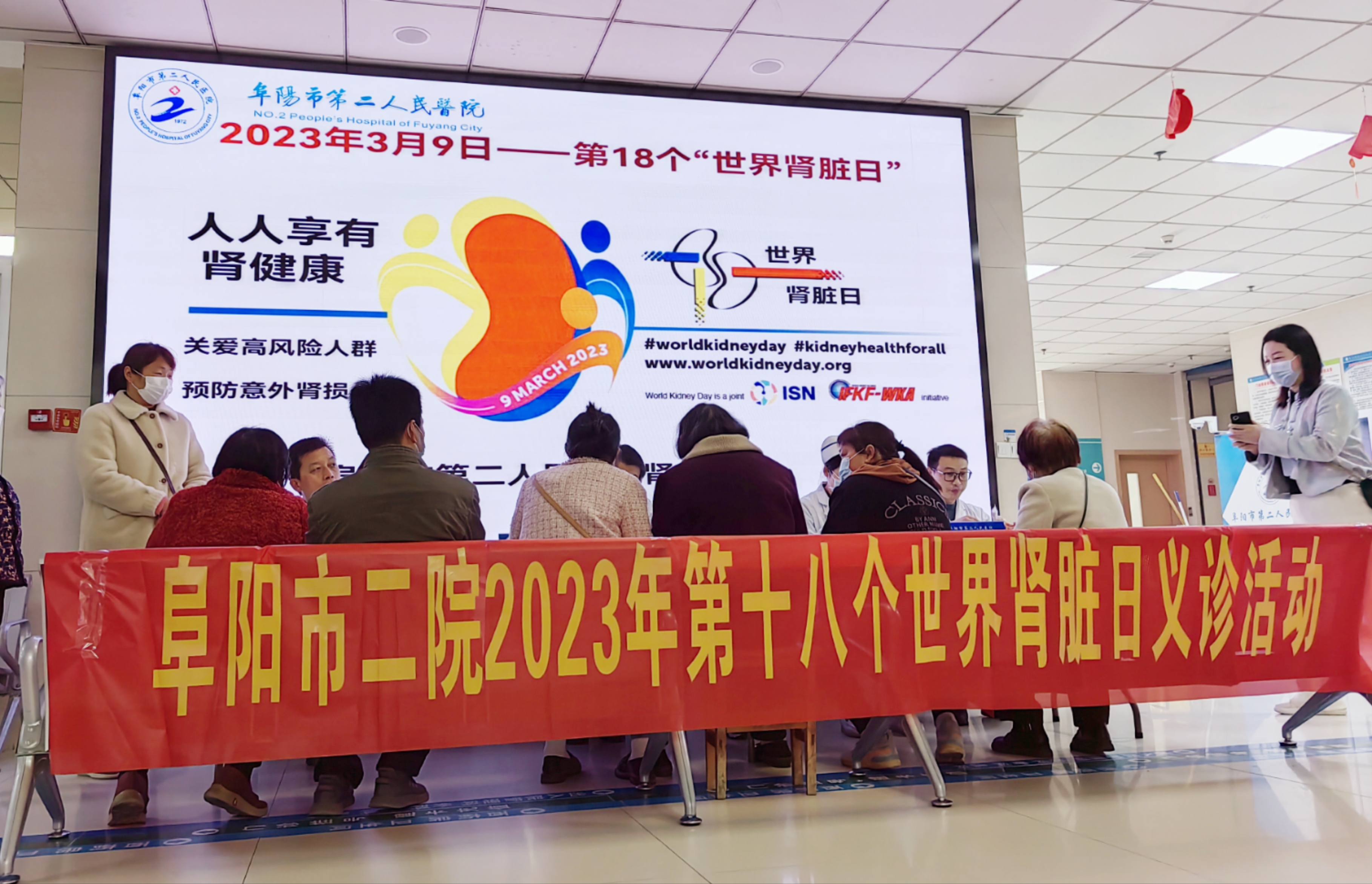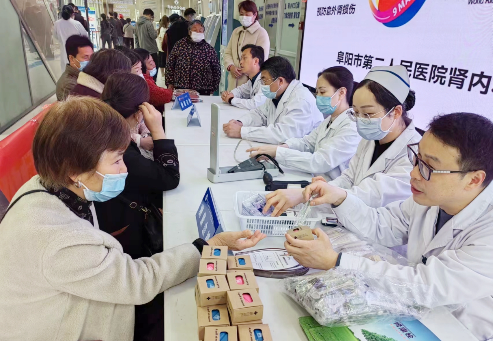 在第18个“世界肾脏日”来临之际,为提高群众对肾脏病的知晓水平,阜阳市第二人民医院肾脏内科于3月9日上午在医院门诊大厅开展了主题为“人人享有肾健康---关爱高风险人群,预防意外肾损伤”的义诊及科普活动。