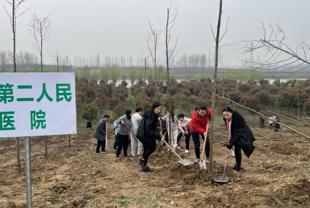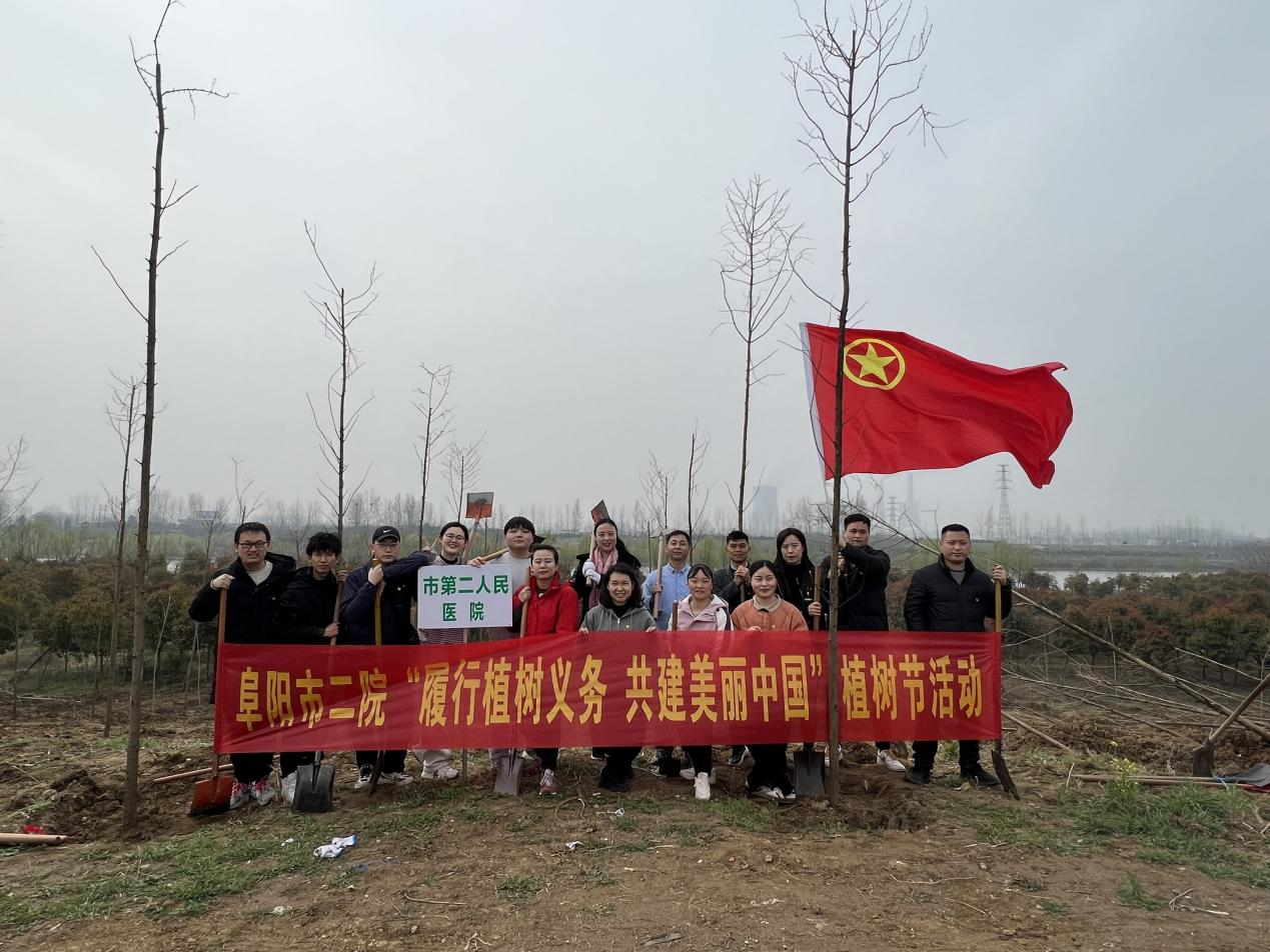 春风催新绿,植树正当时。在全民义务植树活动 45周年之际,为认真贯彻落实习近平生态文明思想,推动绿美城乡和全民义务植树活动深入开展,掀起全市春季植树造林高潮,着力推进国土绿化,3月19日上午,阜阳市第二人民医院团委组织团员青年与全市各单位等百余名共青团员一起,前往颍泉区S238省道茨淮新河北岸大桥西侧绿化带,参加了“履行植树义务、共建美丽中国”全民义务植树活动。