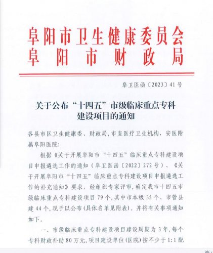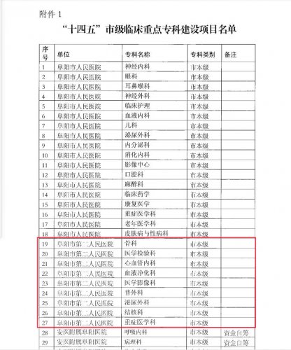 | 喜讯!阜阳市二院获批9个“十四五”市级临床重点专科建设项目 | ||||