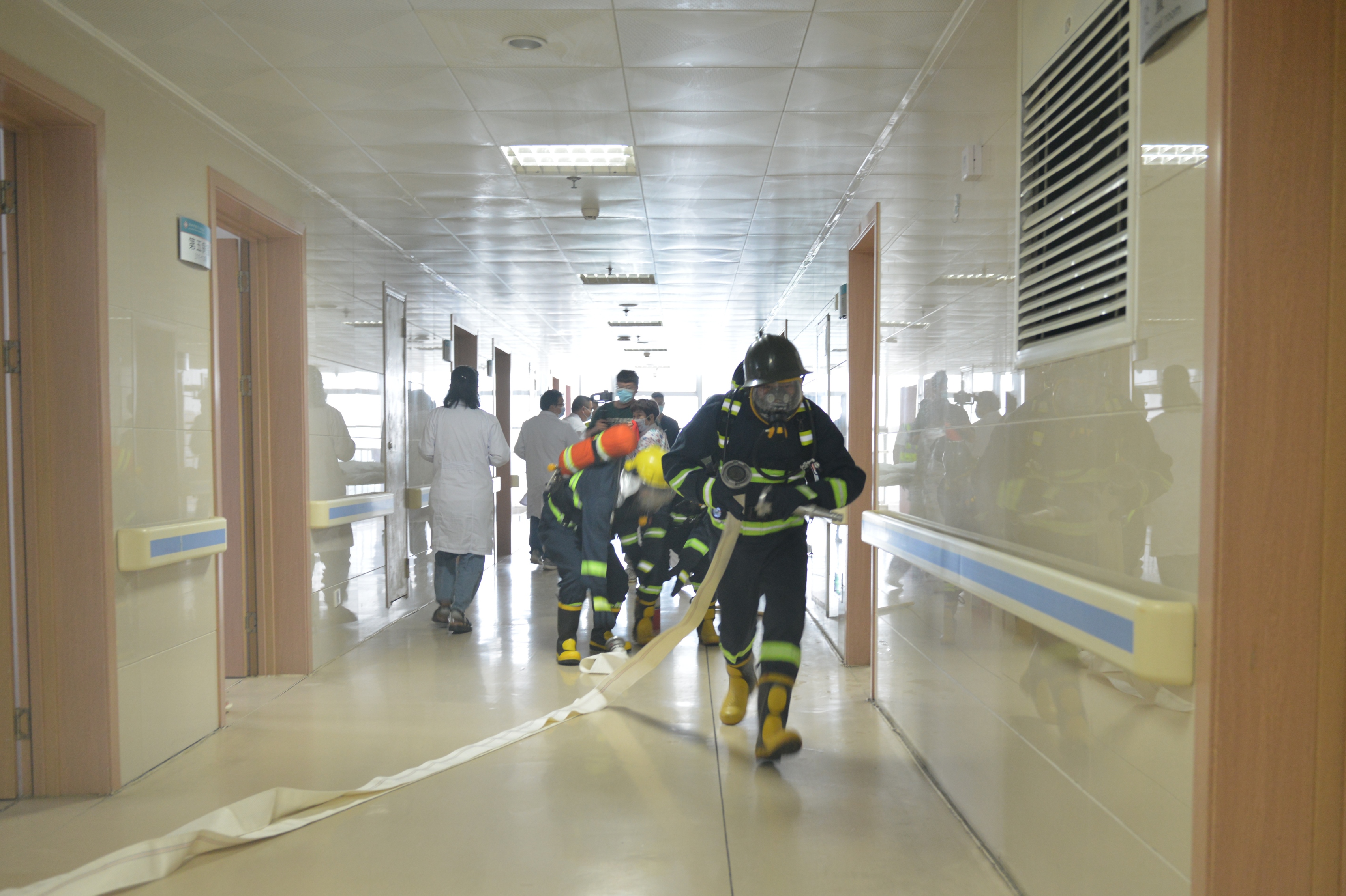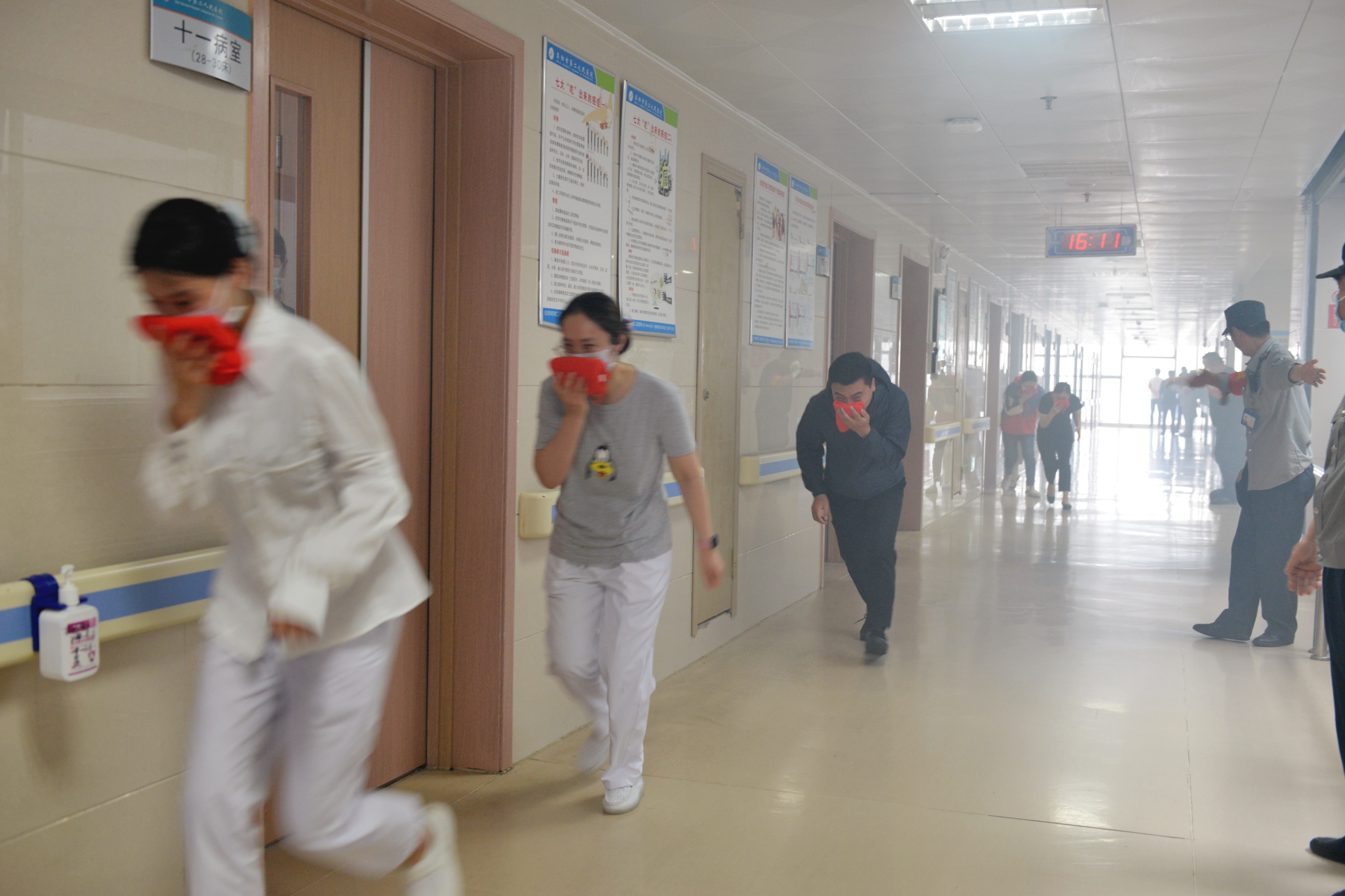 本次演练历经应急预案启动、三分钟应急响应、病区火灾扑救、人员应急疏散、现场救援和伤员抢救等五个过程。