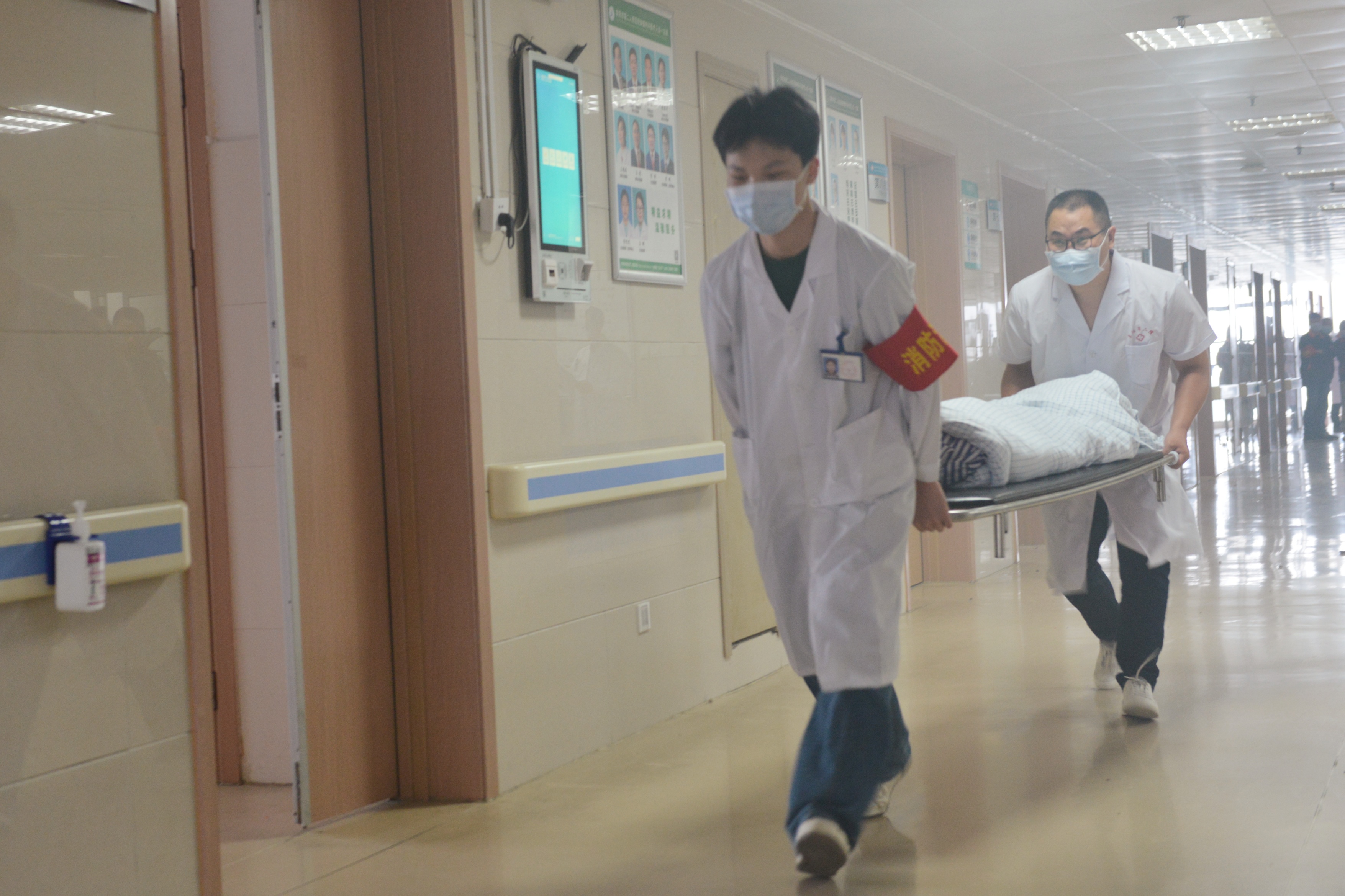 演练现场:当日16:15,模拟该院肿瘤内科第七病室突然浓烟外滚,火警声与医患呼叫声急切混杂,消防控制室接到火灾报警信号,确认“火情”发生后,紧急启动消防设施设备,并向119指挥中心和颍州区公安局颍西派出所报警。医院微型消防站灭火战斗组、医疗救护组、后勤保障组等相关人员迅速赶赴现场,各司其责、应急处置。肿瘤内科值班医生立即冲出医生办公室,打开消防柜门,取出灭火器,奔向第七病室,展开扑救。火情仍未得到有效控制,科室主任和主班护士迅速指导患者及家属逃生疏散,值班医生在患者家属的配合下,紧急抬出隔壁病室的危重症患者逃生。一名患者在逃生中不幸摔断上肢,医疗救护组人员迅速上前进行简单包扎固定,并搀扶其快速小跑。在救援行动持续接力下,成功紧急将病区患者转运至避难间。