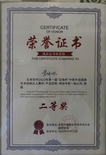 | 阜阳市二院在“迈瑞杯”中青年结直肠手术视频达人赛中荣获第二名 | ||||
