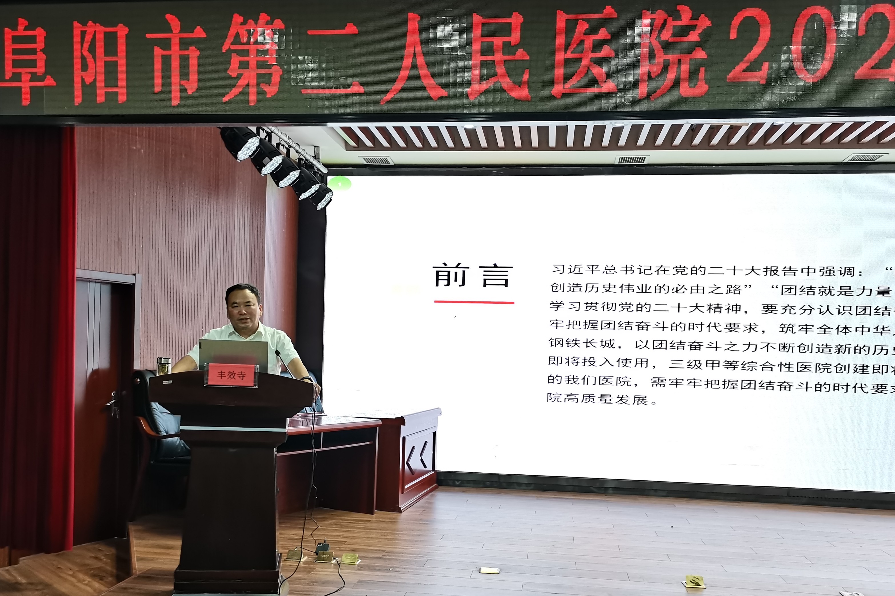 “踏上新征程,我们必须牢牢把握团结奋斗的时代要求,更加紧密地团结在以习近平同志为核心的党中央周围,把思想和行动统一到党的二十大精神上来,万众一心、众志成城、踔厉奋发、勇毅前行,凝聚起以新的伟大奋斗创造新的伟业的蓬勃力量……”。院党委书记丰效寺以《牢牢把握团结奋斗的时代要求,凝心聚力推进医院高质量发展》为题,从团结奋斗是中国人民创造历史伟业的必由之路,团结奋斗是党领导人民奋进新征程的必然要求,分析形势、直面问题,凝心聚力推进医院高质量发展三个方面,为全院党员、中层及以上干部上了一堂党课。党课主题鲜明、重点突出,内容丰富、分析透彻,具有很强的理论性、针对性和指导性。