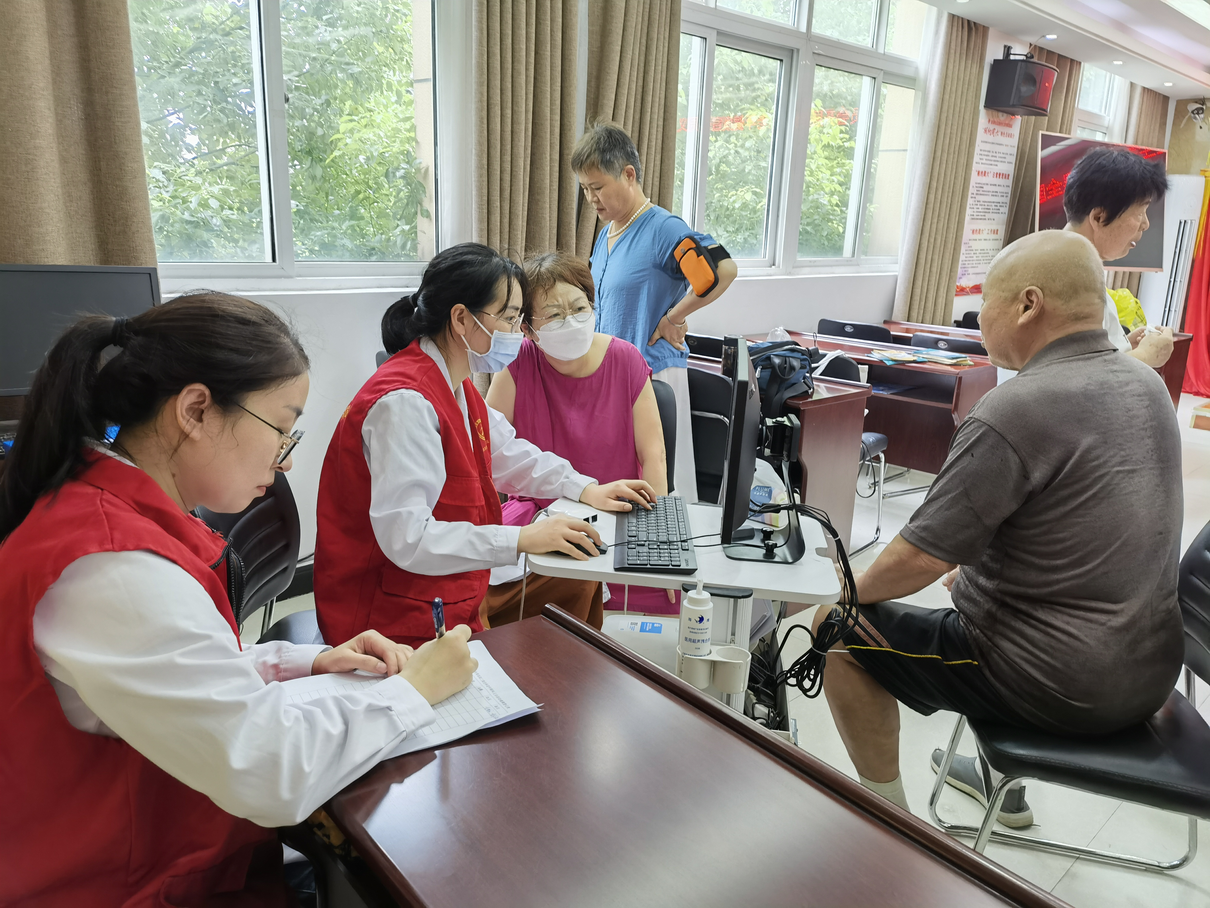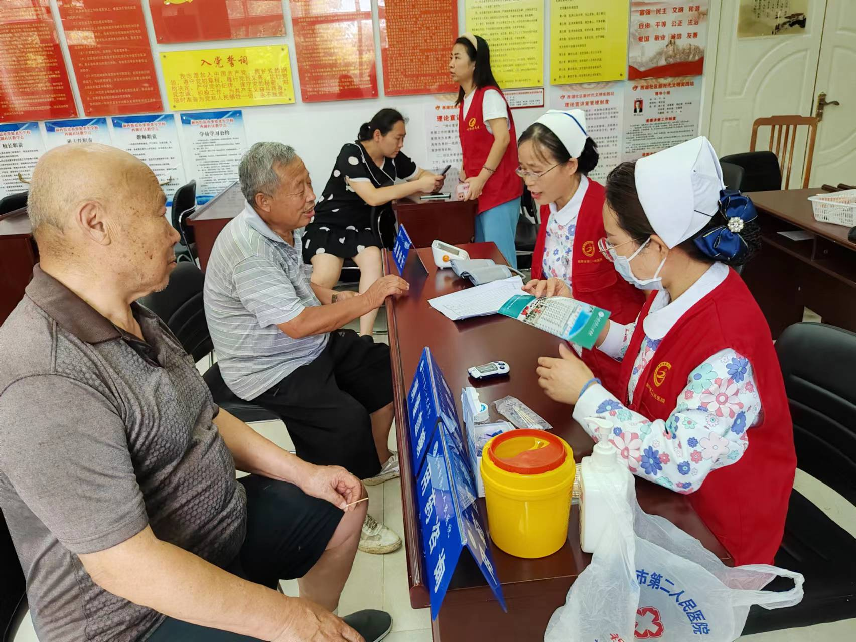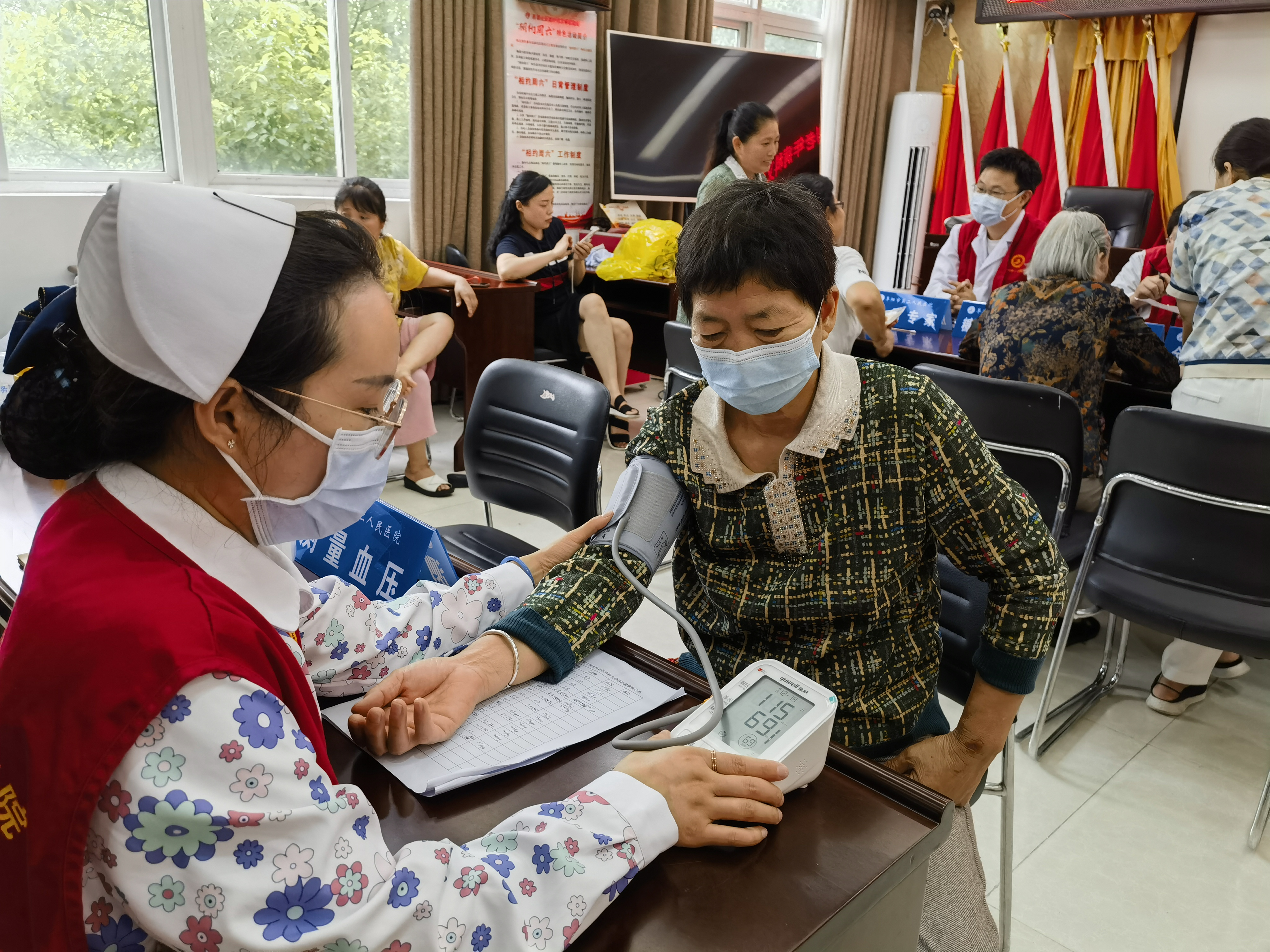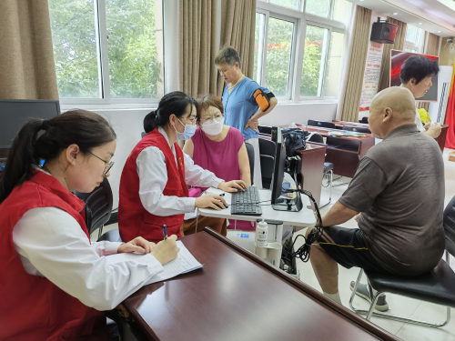 护士长王红丽、主管护师刘晓雪为社区老年居民进行血压、血糖的测定,认真登记老人们的健康数据。并对老人们进行健康宣教。