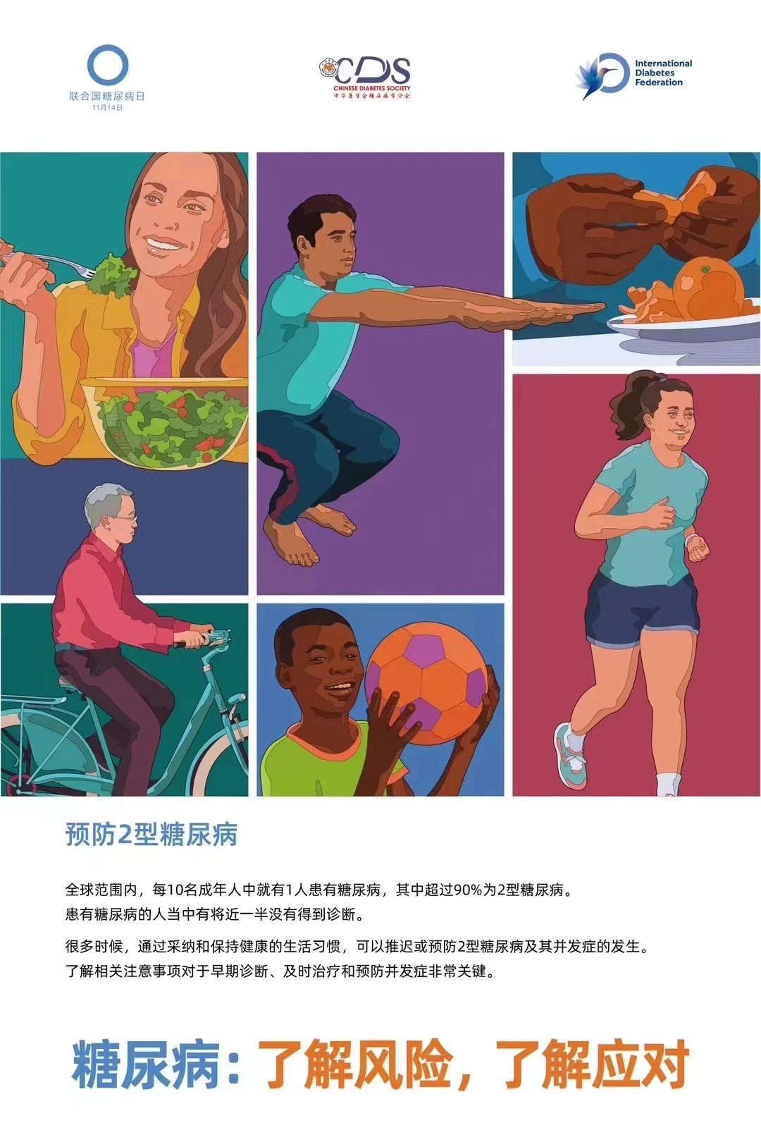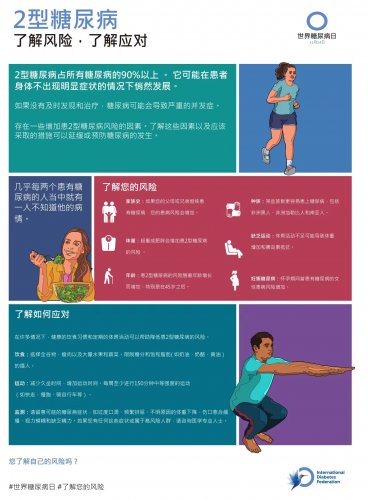 今年联合国糖尿病日的主题是“了解风险、了解应对”,侧重于帮助人们了解患上2型糖尿病的风险以帮助延迟或预防其发生,强调糖尿病相关并发症的影响,以及获取正确信息和护理,以确保及时的治疗和管理。