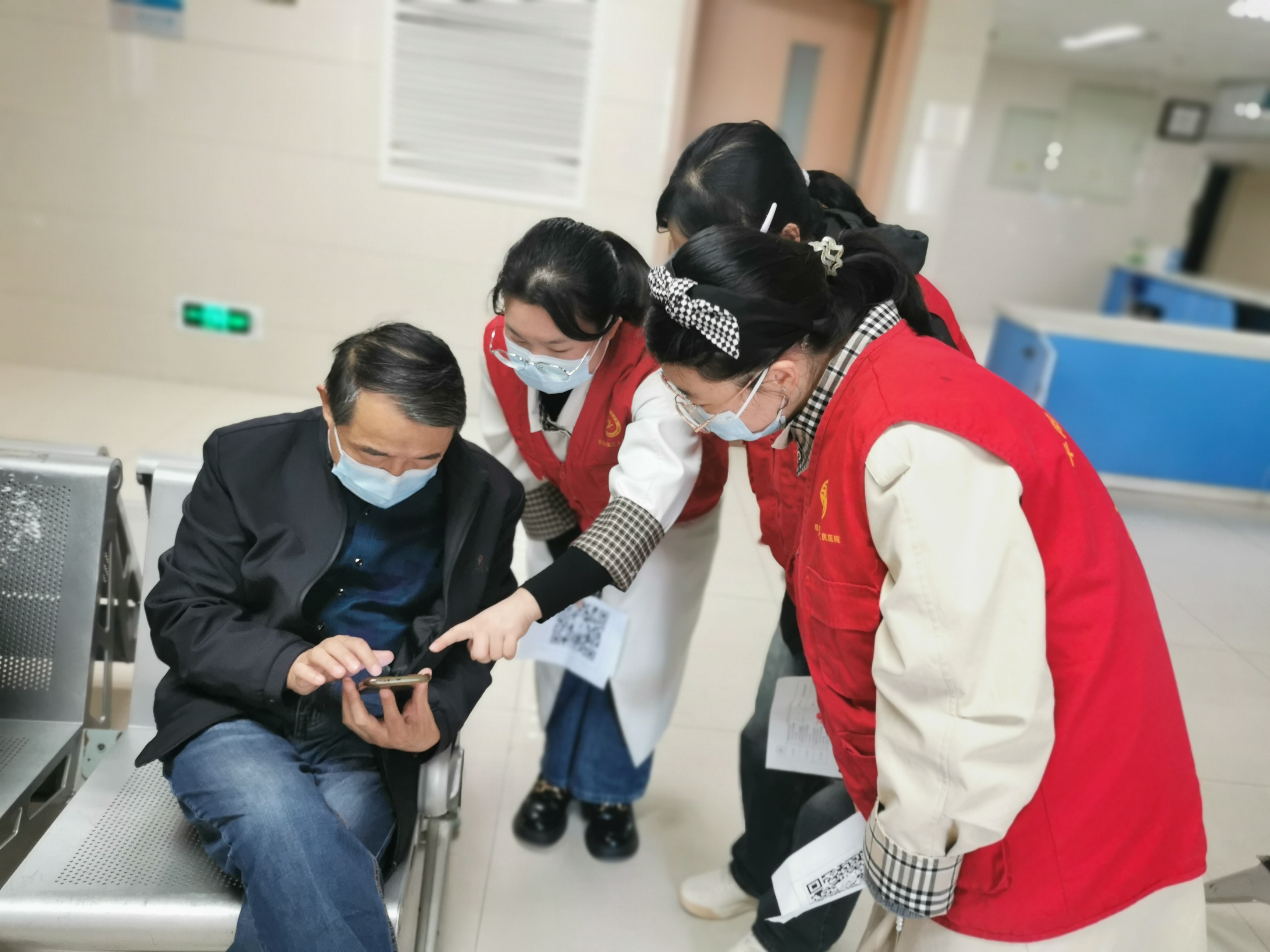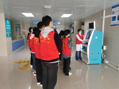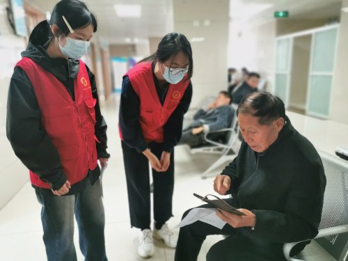 大学生志愿者们分成3组来到候诊区,向各候诊区域老年患者详细讲解了如何关注市第二人民医院服务号、使用智能手机线上预约挂号以及查询检验报告等常用知识,手把手地指导老人实际操作。