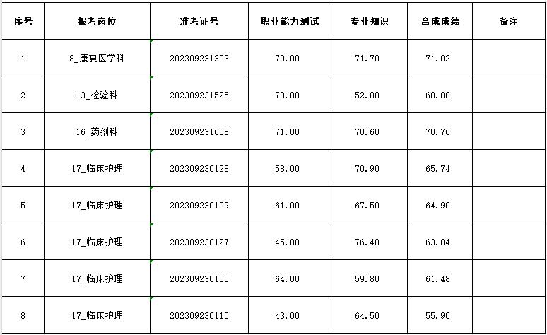 根据《安徽省公共卫生临床中心(阜阳)阜阳市第二人民医院2023年度自主招聘公告》,我院对资格审核中出现缺额以及与招聘条件要求不符的,取消其入围资格,空缺指标在同岗位报考人员中,按笔试总成绩依次等额递补一次。 请以下人员参照医院官网2023年11月14日发布的《阜阳市第二人民医院2023年度自主招聘面试入围人员资格复审的通知》,携带通知中所要求的证件于2023年11月22日(8:30-11:00、15:00-17:00)到阜阳市第二人民医院人事科进行资格复审。未按期进行资格复审的视为自动放弃面试入围资格。 阜阳市第二人民医院 2023年11月20日 |