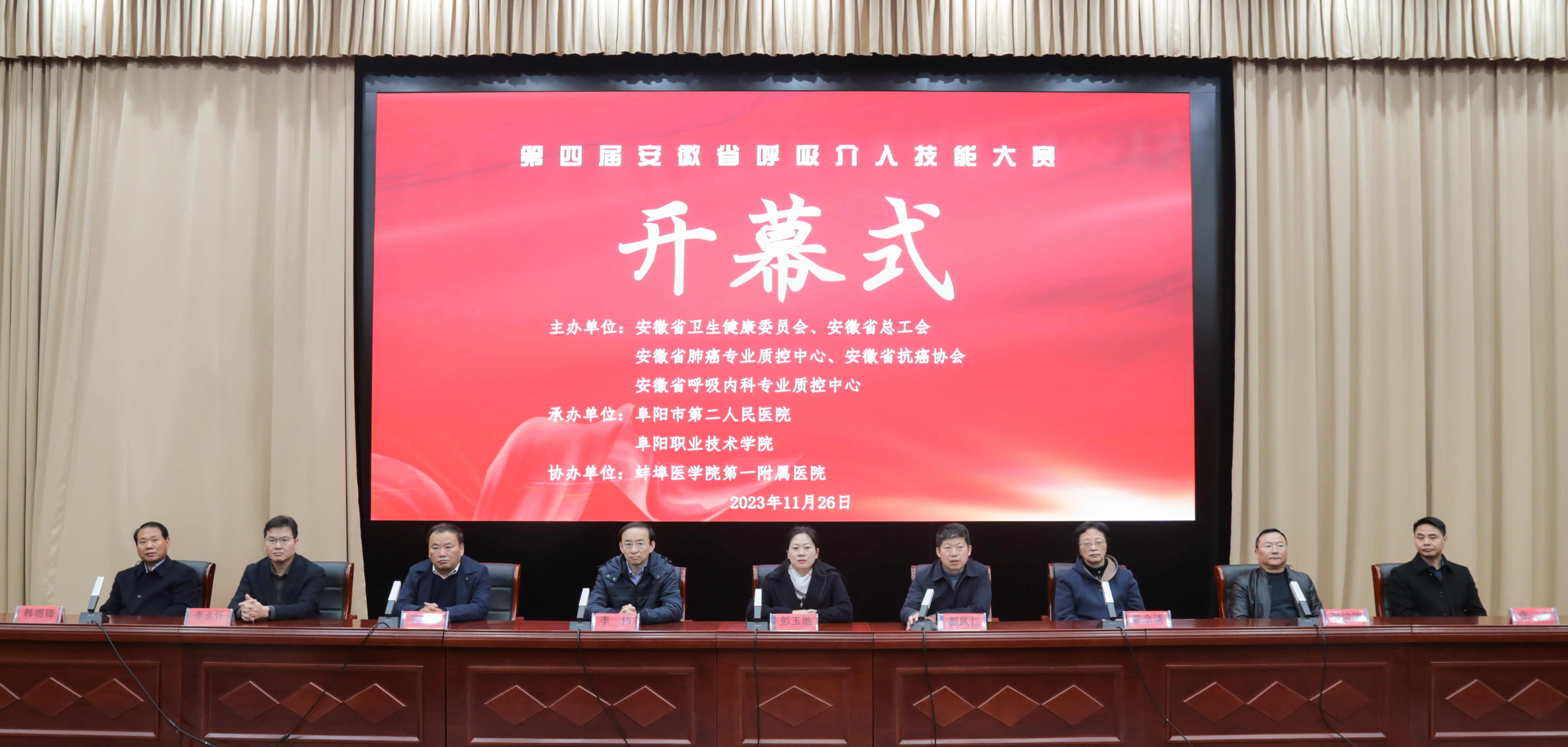 11月26日上午,开幕式在阜阳职业技术学院综合报告厅举行,阜阳市第二人民医院党委副书记、院长韩明锋主持。安徽省卫生健康委员会医政医管处副处长彭玉池,阜阳市卫生健康委党组书记、主任都凤仁,蚌埠医学院第一附属医院主任医师、教授、博士生导师陈余清,蚌埠医学院第一附属医院党委副书记李伟,安徽医科大学第四附属医院副院长李永怀,阜阳市第二人民医院党委书记丰效寺,阜阳职业技术学院医学院党总支书记、院长徐幼坤,蚌埠医学院第一附属医院呼吸与危重症医学科主任张永出席。