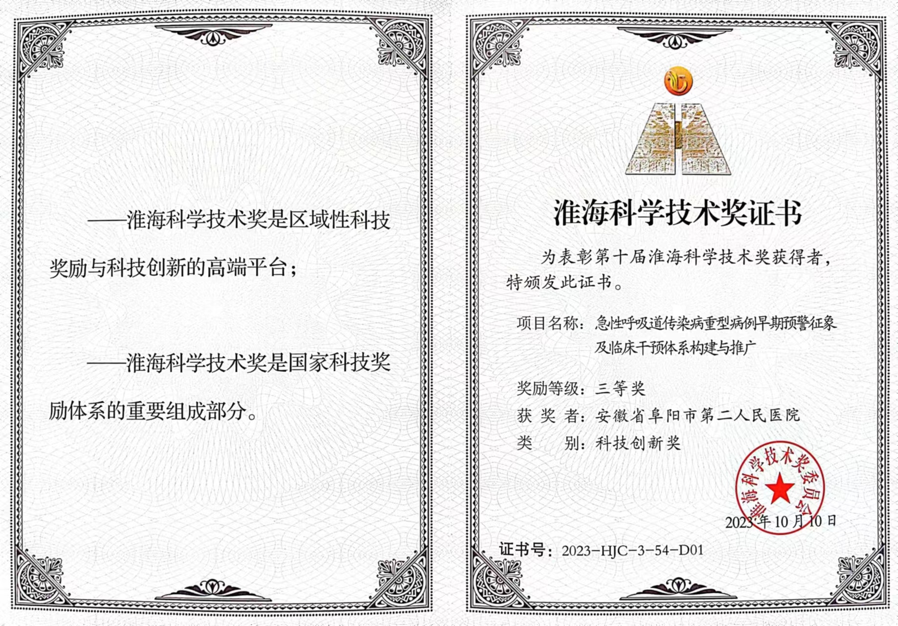 10月10日,韩明锋团队开展的“急性呼吸道传染病重型病例早期预警征象及临床干预体系构建与推广"科研创新项目获第十届淮海科学技术奖三等奖。