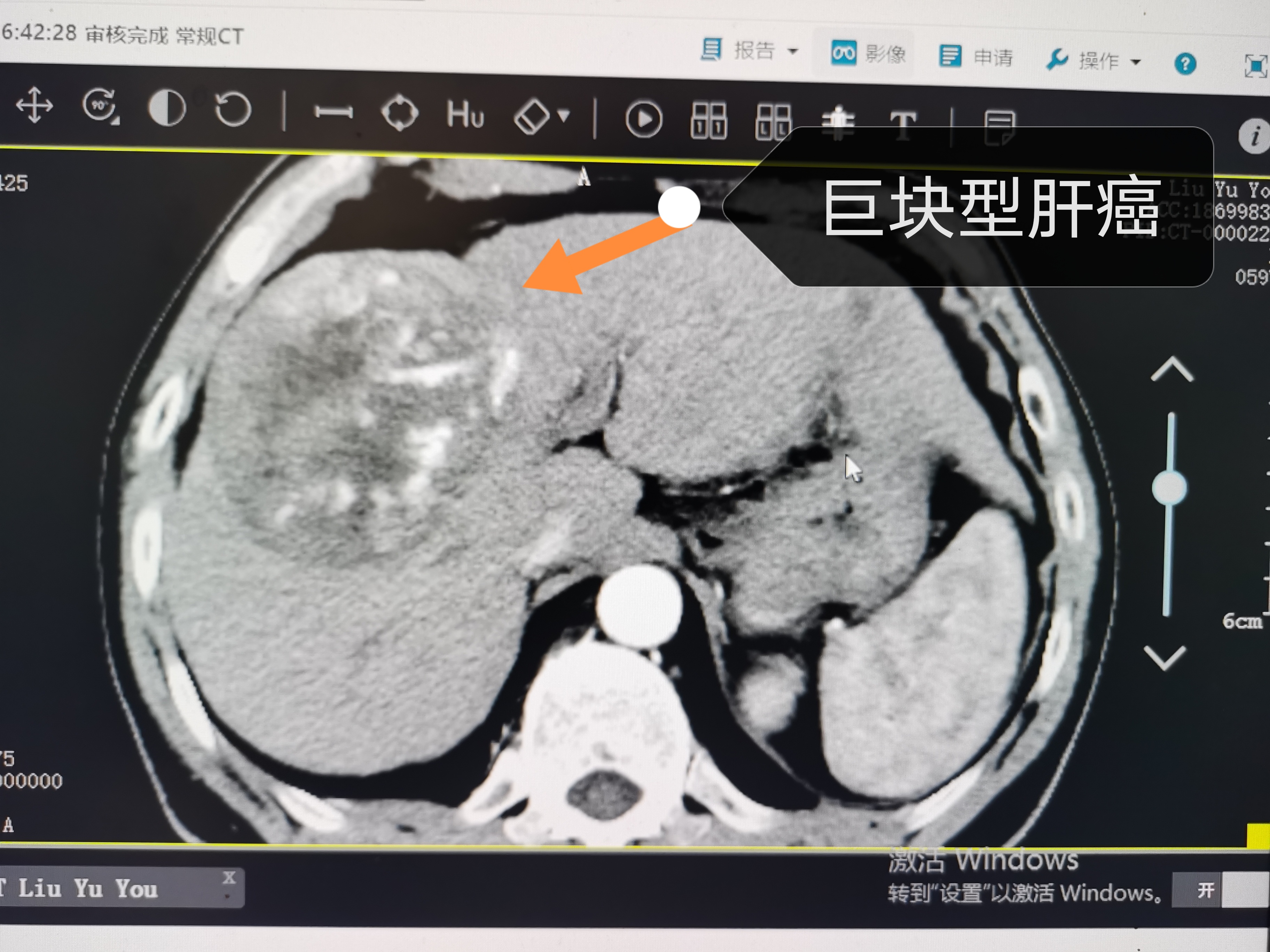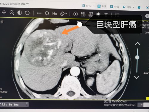 据了解,该患者姓刘,59岁,家住阜南县某乡镇,一周前在自家养殖场工作时,不慎被牛顶到右上腹,之后就隐隐作痛持续不能缓解,家人不放心带他到当地卫生院,予以口服药物治疗,未见明显好转,拍了一个上腹部CT平扫片,提示肝右叶占位伴其内出血可能。随后,患者就诊市第二人民医院肝病科,门诊医生马珺珺根其病史并结合当地医院CT检查,考虑不排除肝癌可能,随做增强CT提示:肝右叶可见团块状混杂密度影,大小约93*84mm。此外,还有2处可疑子灶,增强三期符合肝癌影像学诊断标准。刘大叔及家人以为被牛顶出来的腹痛,没想到原凶竟是巨块型肝癌。