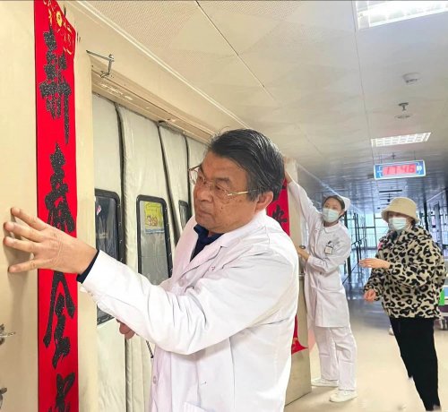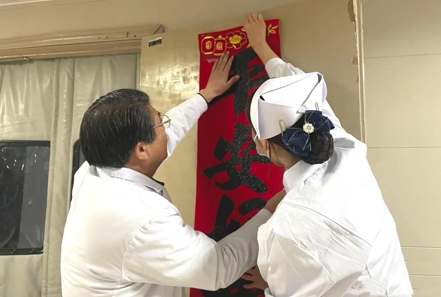 “过新年咯!”除夕这天一大早,肾内科的医护人员们在院党委委员、肾内科主任、江淮名医、安徽省“五一”劳动奖获得者李龙海的带领下,就早早的把火红的春联贴好,并与住院患者一起写福字、送祝福,让大家在病房感受到春节的氛围以及医院的祝福和关怀。