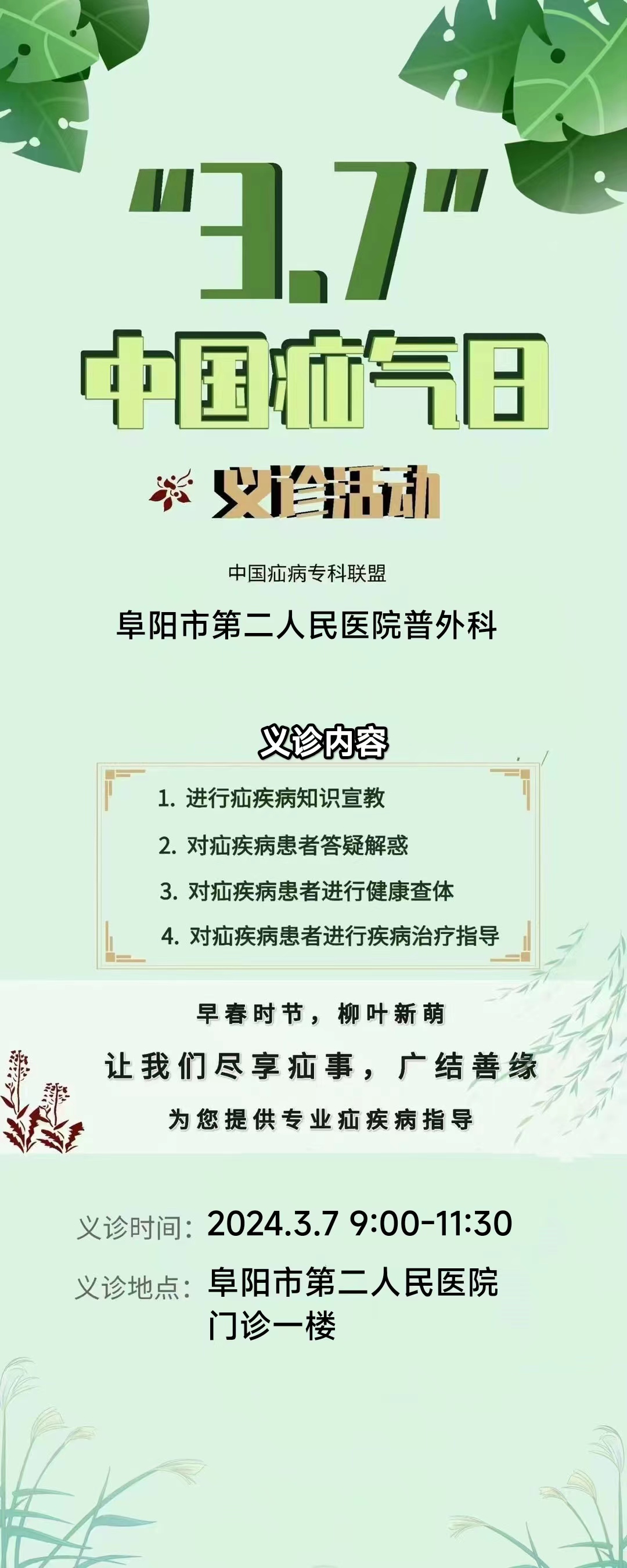 2024年3月7日是第二届“3.7中国疝气日”,为提高群众对疝疾病预防及治疗的认识,让广大患者摆脱疝疾病的困扰。阜阳市第二人民医院普通外科将于3月7日组织开展健康宣传义诊活动。
