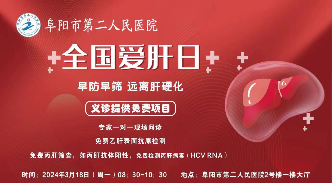 同时,为深入贯彻《健康中国2030规划纲要》,形成全社会共同爱肝护肝、防治纤维化的良好氛围,助力消除全球病毒性肝炎目标,阜阳市第二人民医院联合阜阳市医学会肝病学分会、阜阳市医学会感染病学分会将开展“全国爱肝日”义诊宣传活动,提高公众爱肝护肝早防早筛的意识。届时,我院资深肝病专家将为广大市民朋友和肝病病友提供权威的健康咨询服务及免费筛查。