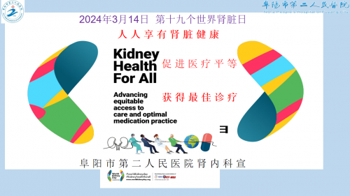 2024年3月14日为第19个“世界肾脏日”,今年世界肾脏日的主题为“人人享有肾脏健康——促进医疗平等,优化用药实践”。为呼吁人民群众对慢性肾脏病的关注,重视慢性肾脏病管理和肾脏健康维护,阜阳市肾脏病学分会十余家医院在行动,分别开展形式多样的世界肾脏日系列活动。