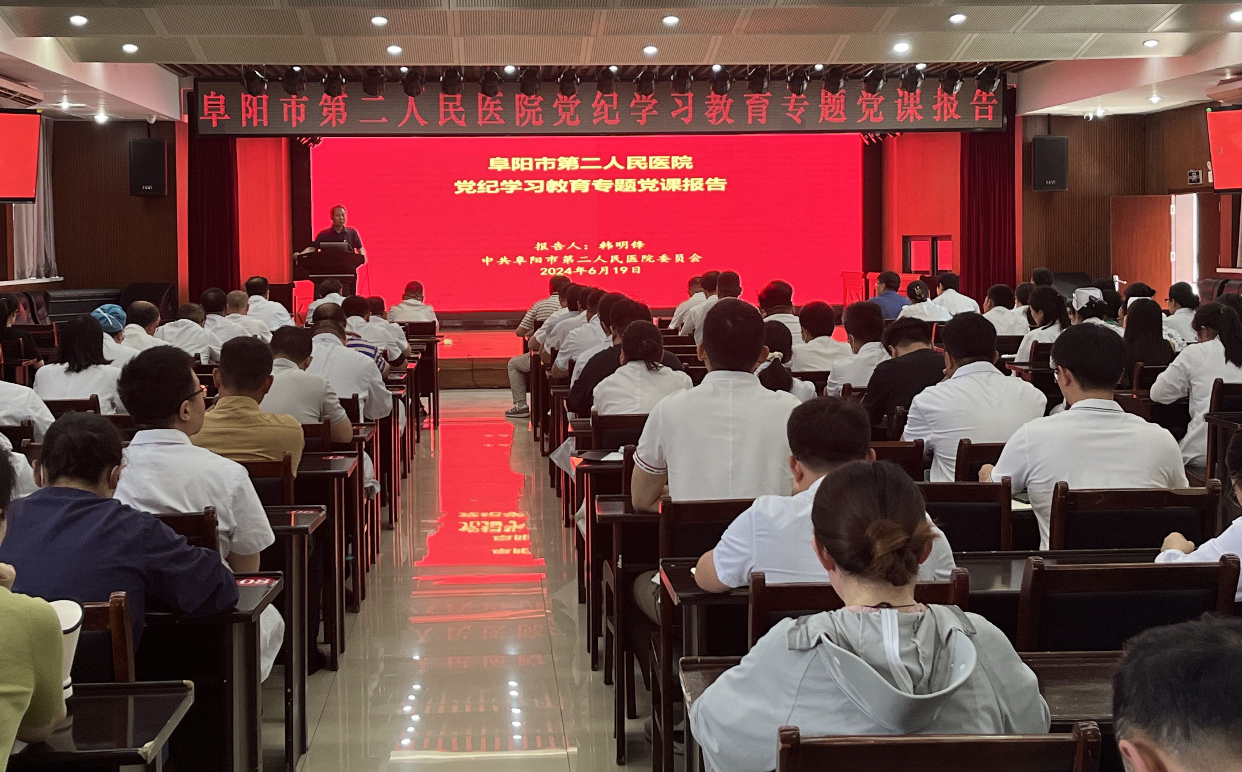 6月19日上午,阜阳市第二人民医院举办党纪学习教育专题党课。院党政领导班子成员、各党支部委员、中层干部、全院在职党员参加。
