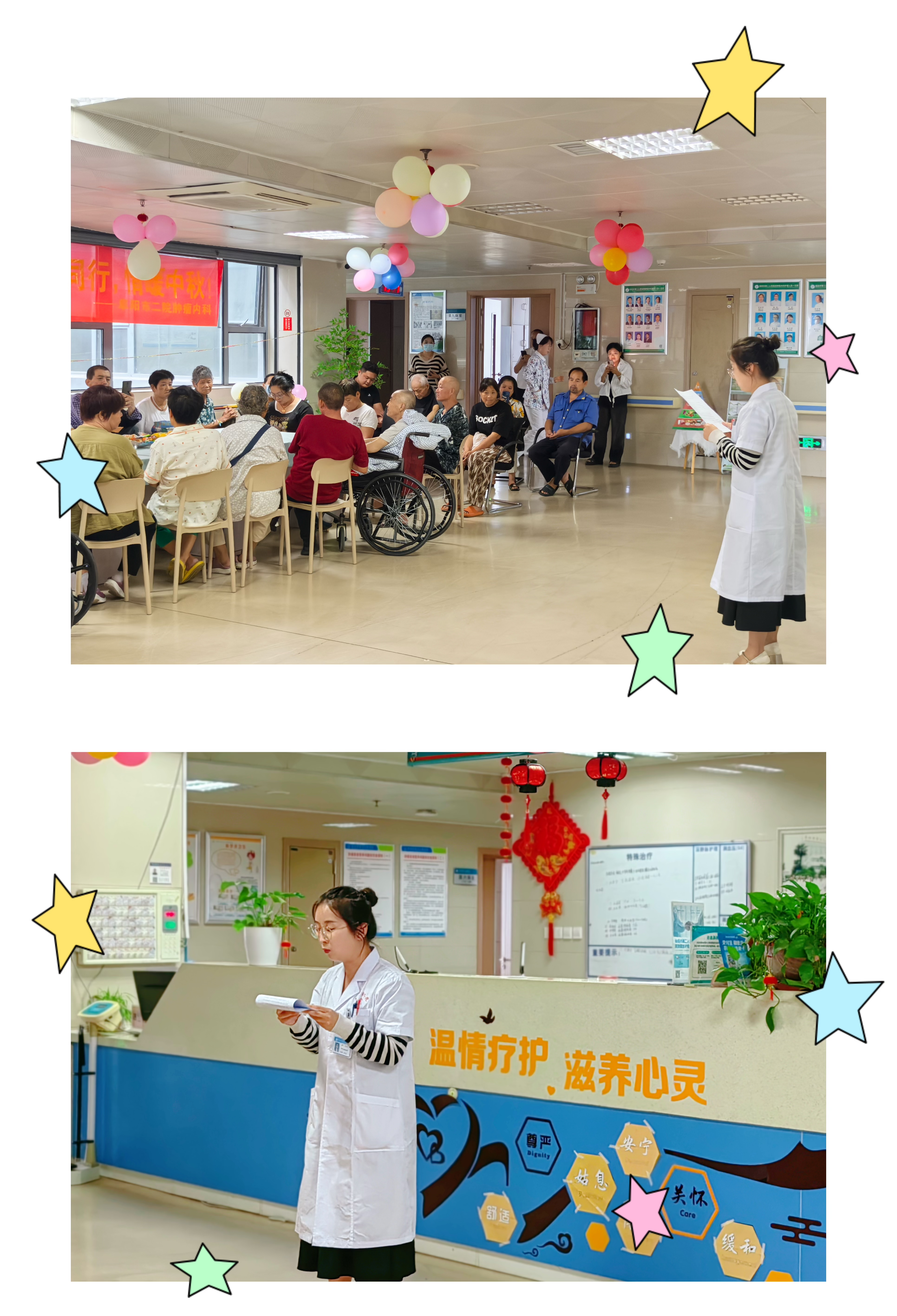 接着,为了营造更加和谐、温馨的住院氛围,科室举办了手工灯笼制作活动,由国家级安宁疗护专科护士李向南老师带领大家一起制作灯笼。大家把美好的愿望写在灯笼上,体现出安宁疗护的点点滴滴,为生命提供抚慰,书写有温度的生命。在制作灯笼的同时,国家级安宁疗护专科护士潘凤娟老师还带领大家一起制作中秋祈福心愿卡。大家写下对自己、家庭、生活的祝福,挂在心愿树上。每一张心愿卡,都承载着每一位病友的独特故事和深刻感悟。