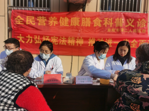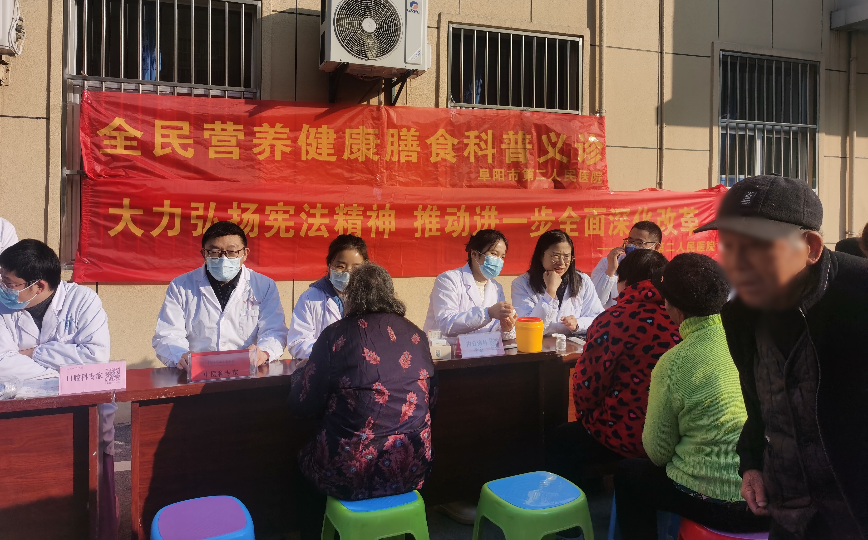 2024年12月1日—12月7日是第七个“宪法宣传周”,为深入持续开展法治宣传教育,弘扬宪法精神,维护宪法权威,进一步增强广大群众的法治观念及提高全民对营养健康膳食的重视。2024年12月6日上午,阜阳市第二人民医院组织中医科主任高学武、心血管内科主任医师方秋芳、内分泌科副主任医师杨静静、康复科副主任医师储丹晨、口腔科医生朱兴志及临床营养科医生王翠翠等医生,在阜南县会龙镇卫生院门诊楼前广场开展“宪法宣传周”活动及全民营养健康膳食科普义诊。